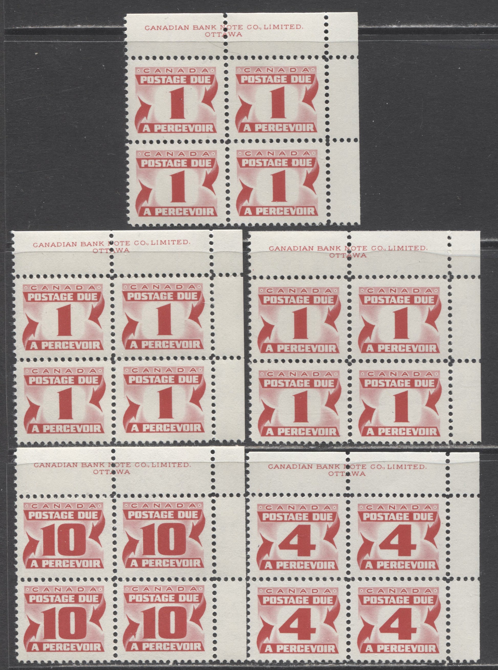 Lot 361 Canada #J28, J31, J35 1c, 4c & 10c Carmine Rose, 1969 Second Centennial Red Postage Due Issue, 5 VFNH UR Inscription Blocks Of 4 With Different Papers & Gums