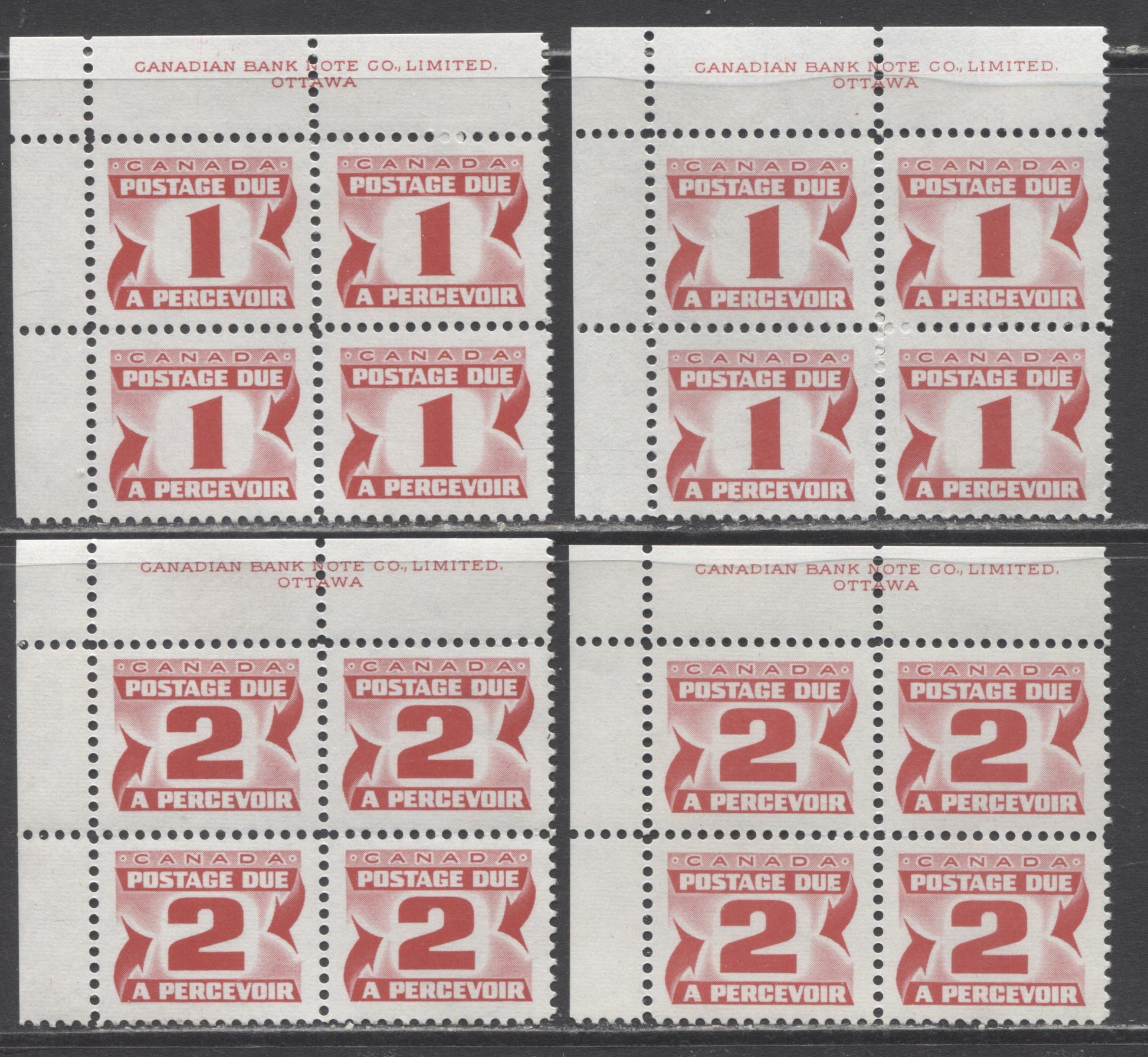 Lot 363 Canada #J28i,ii,J29i 1c & 2c Carmine Rose, 1973-1974 Third Centennial Red Postage Due Issue, 4 VFNH UL Inscription Blocks Of 4 With DF Ivory, DF Grayish Ribbed & LF Bluish White Ribbed Papers