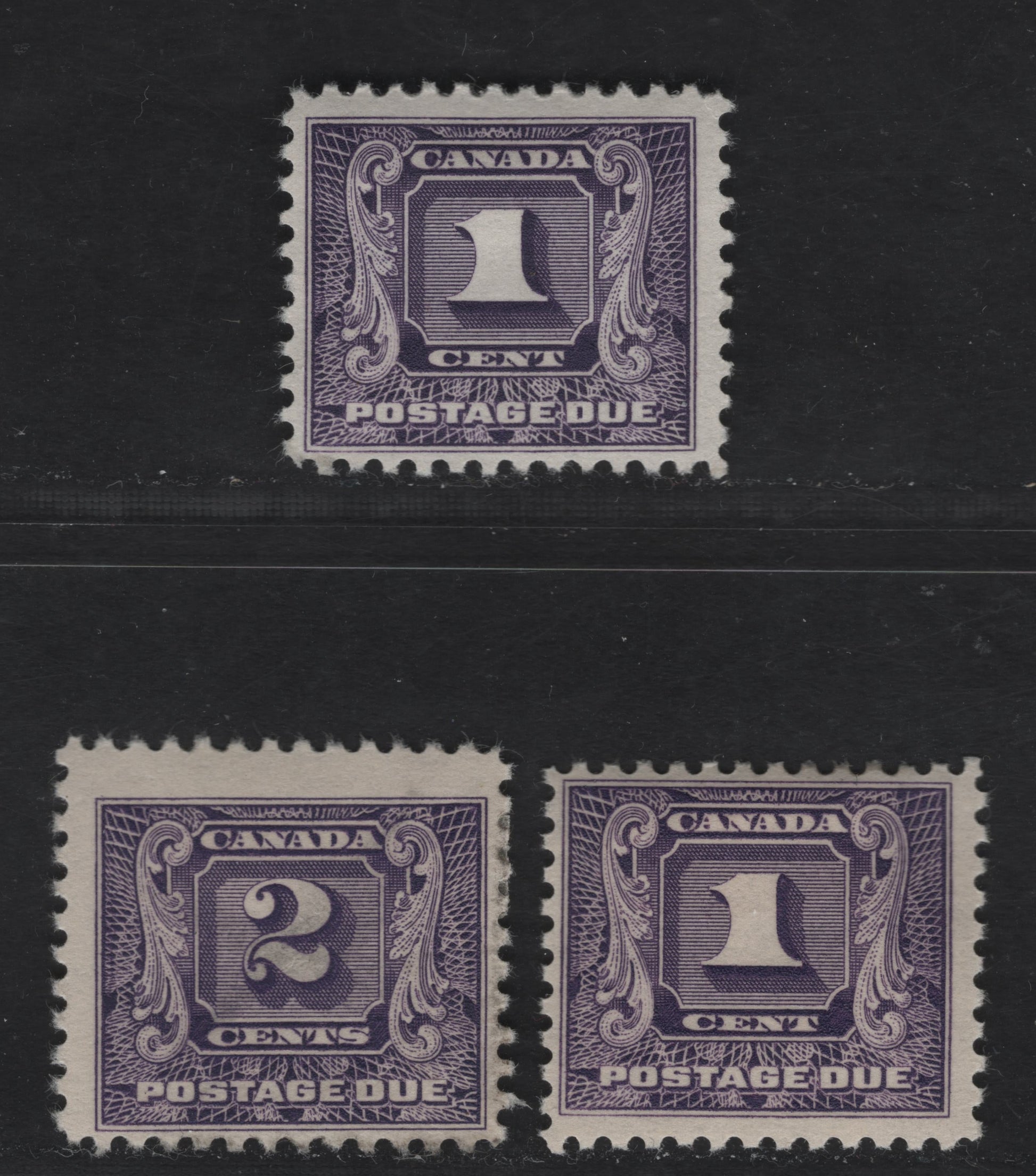 Canada #J6-J7 1c-2c Bluish Violet Numeral On Fancy Background, 1930-1932 Second Postage Due Issue, 3 Fine OG Singles With Yellowish & Cream Semi-Gloss Gum