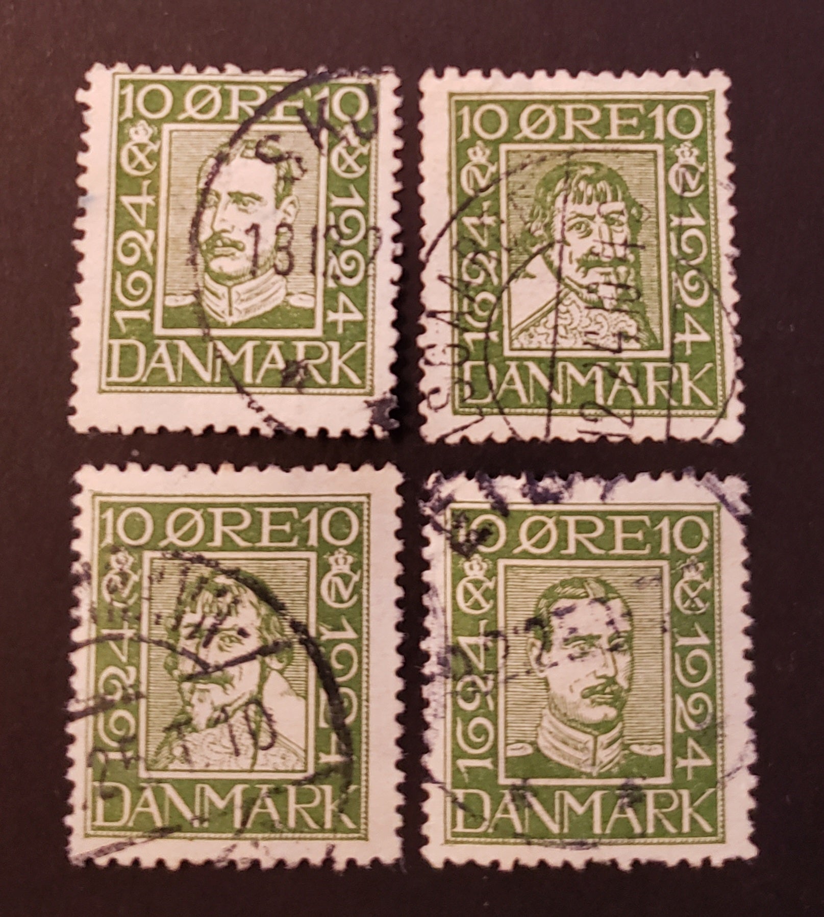 4 Fine Used singles from the 1924 300th Anniv. Of The Danish Postal Service Issue. The Scott numbers range from 164 to 167, and include 164-167. 2017 Scott Cat. $28.
