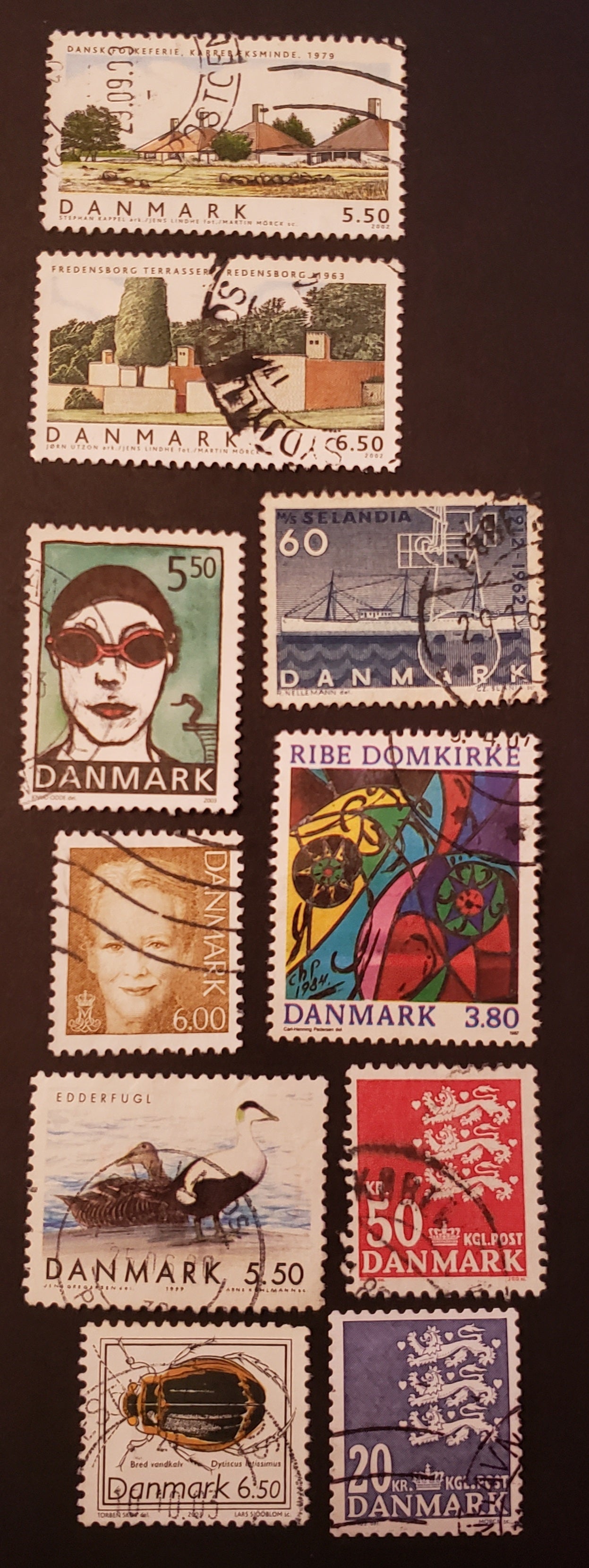 Denmark SC#403/1312 1962-2007 M.S. Selandia / Small State Seal Issues, 10 F-VF Used Singles, 60o Ship Has Full UR Corner, But Cancel Conceals It, Click on Listing to See ALL Pictures, 2017 Scott Cat. $17