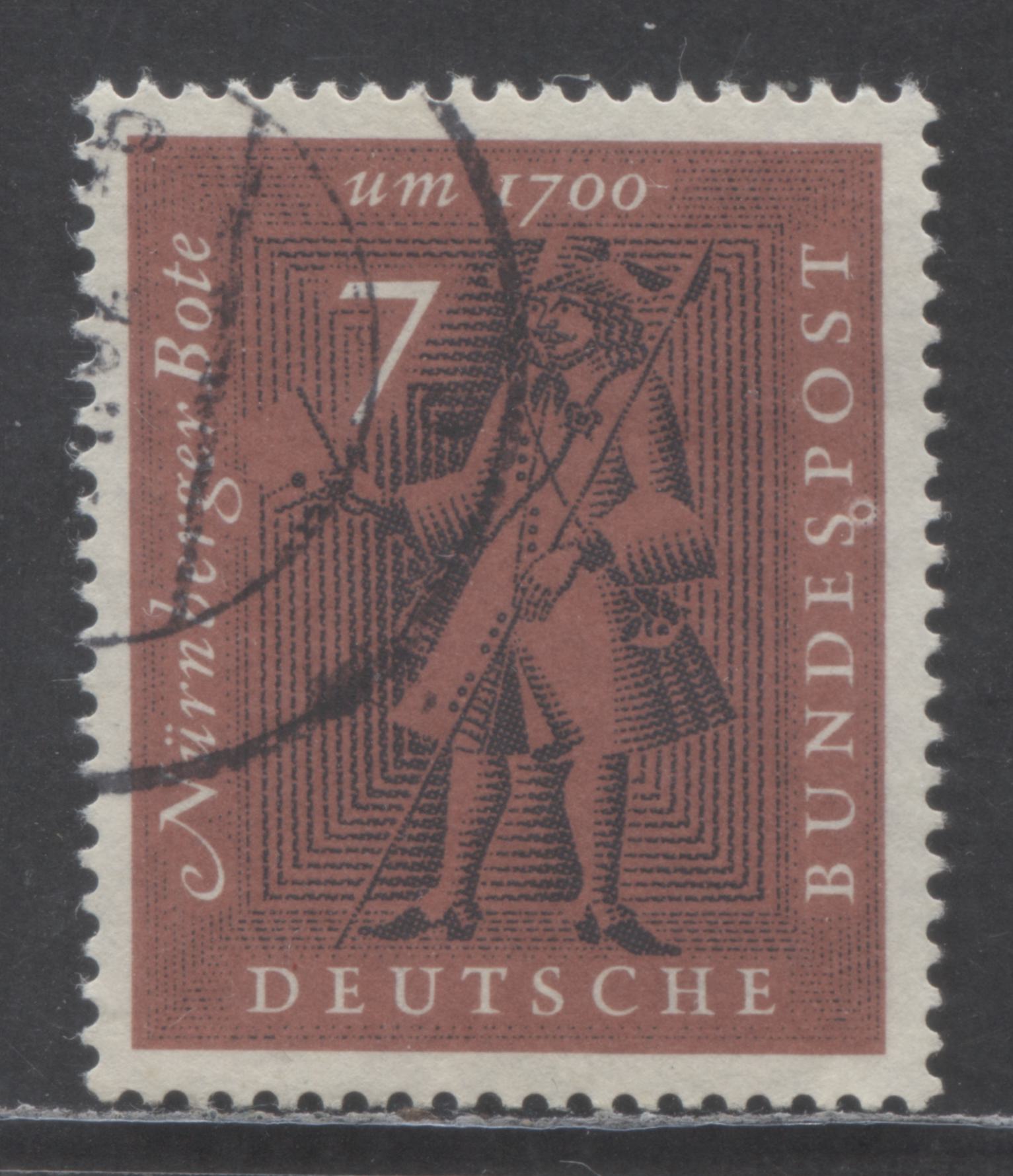 A very fine used example of the 7pf red brown from the 1961 Commemorative Issue, unlisted dot under 's' of bundespost. Our estimate of the value based on the condition is $5.
