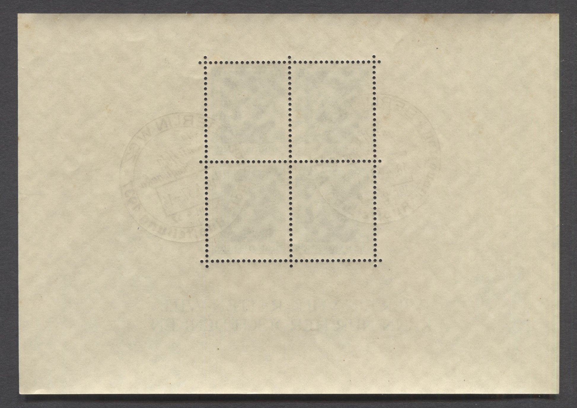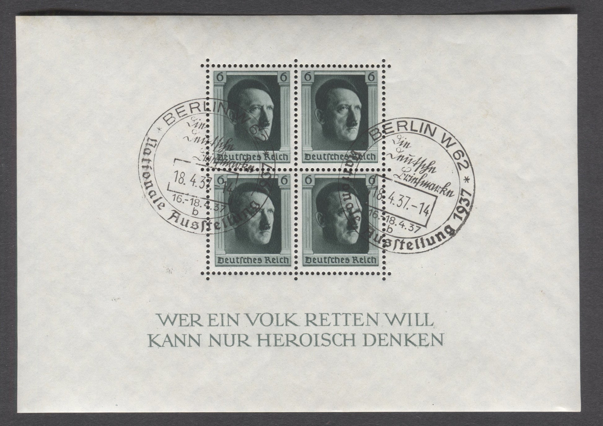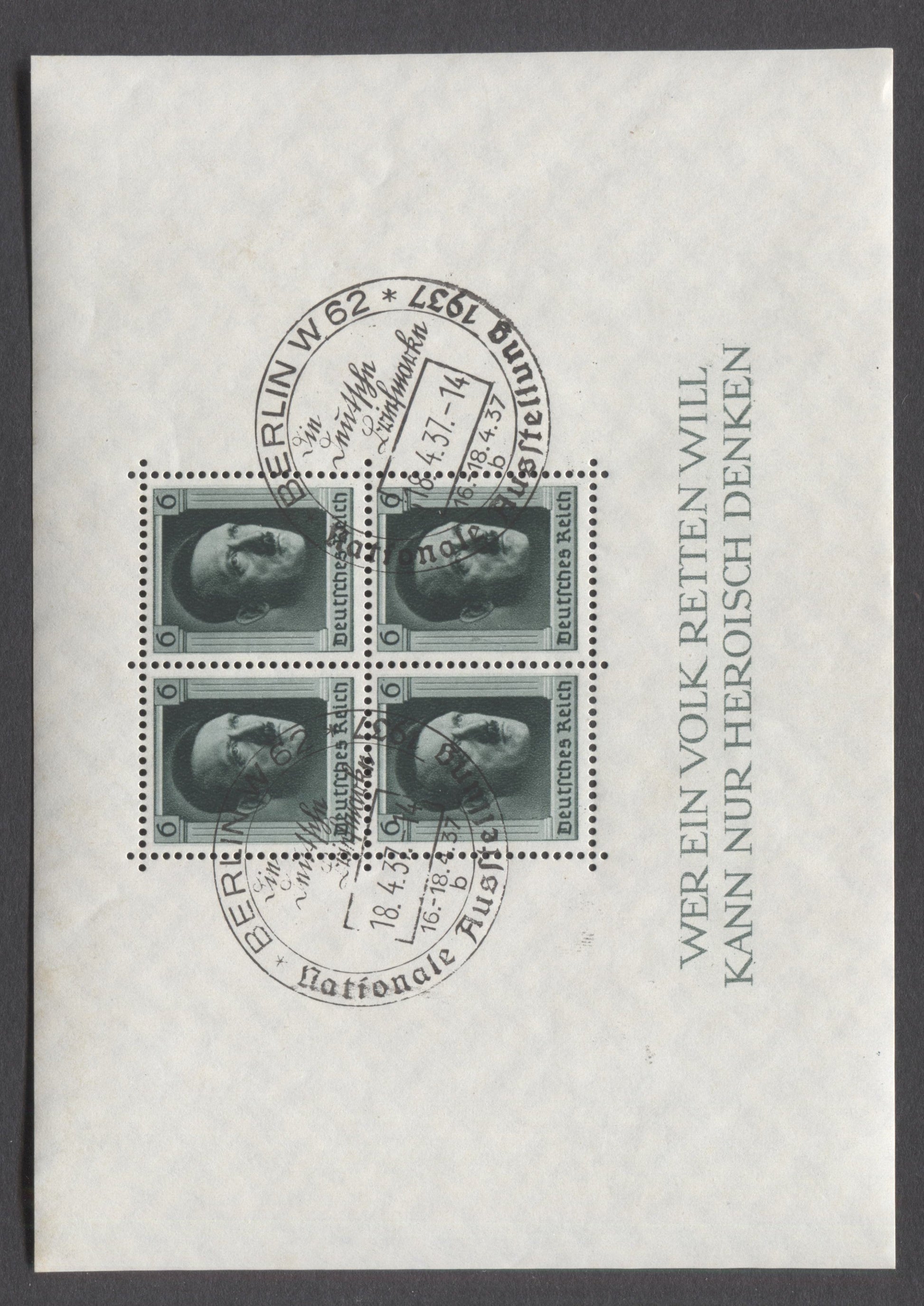 A VFCTO souvenir sheet of the 6pf greenish black from the 1937 Hitler's 48th Birthday Semi Postals, dated April 18, 1937, full NH gum. With Commemorative Berlin W62 Cancel. 2017 Scott cat. $55. Our estimate of the value based on the condition is $30.