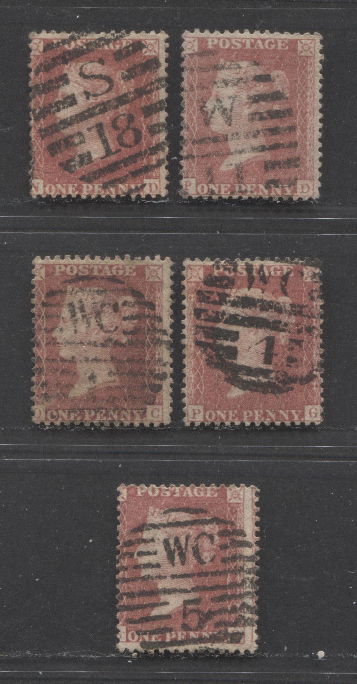Lot 65 Great Britain - Dubus Type 1c, 4, 6A & 9 Vertical Numeral London Duplex Cancels SC#20 1d Rose Red & Pale Rose Red 1857-1863 1d Red Stars, Large Crown, White Paper, Perf. 14 Issue, 5 Good & VG Used Singles, Estimated Value $22