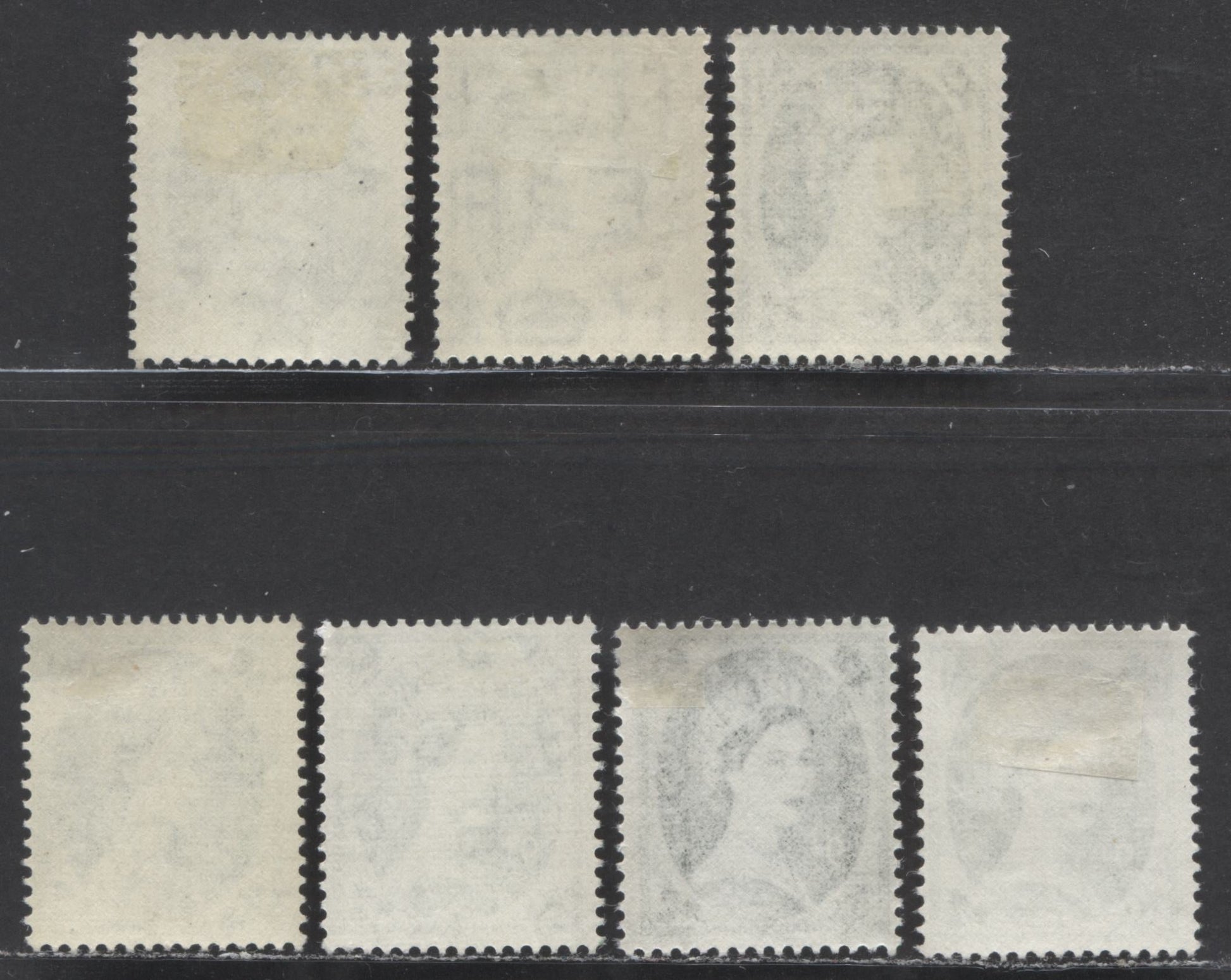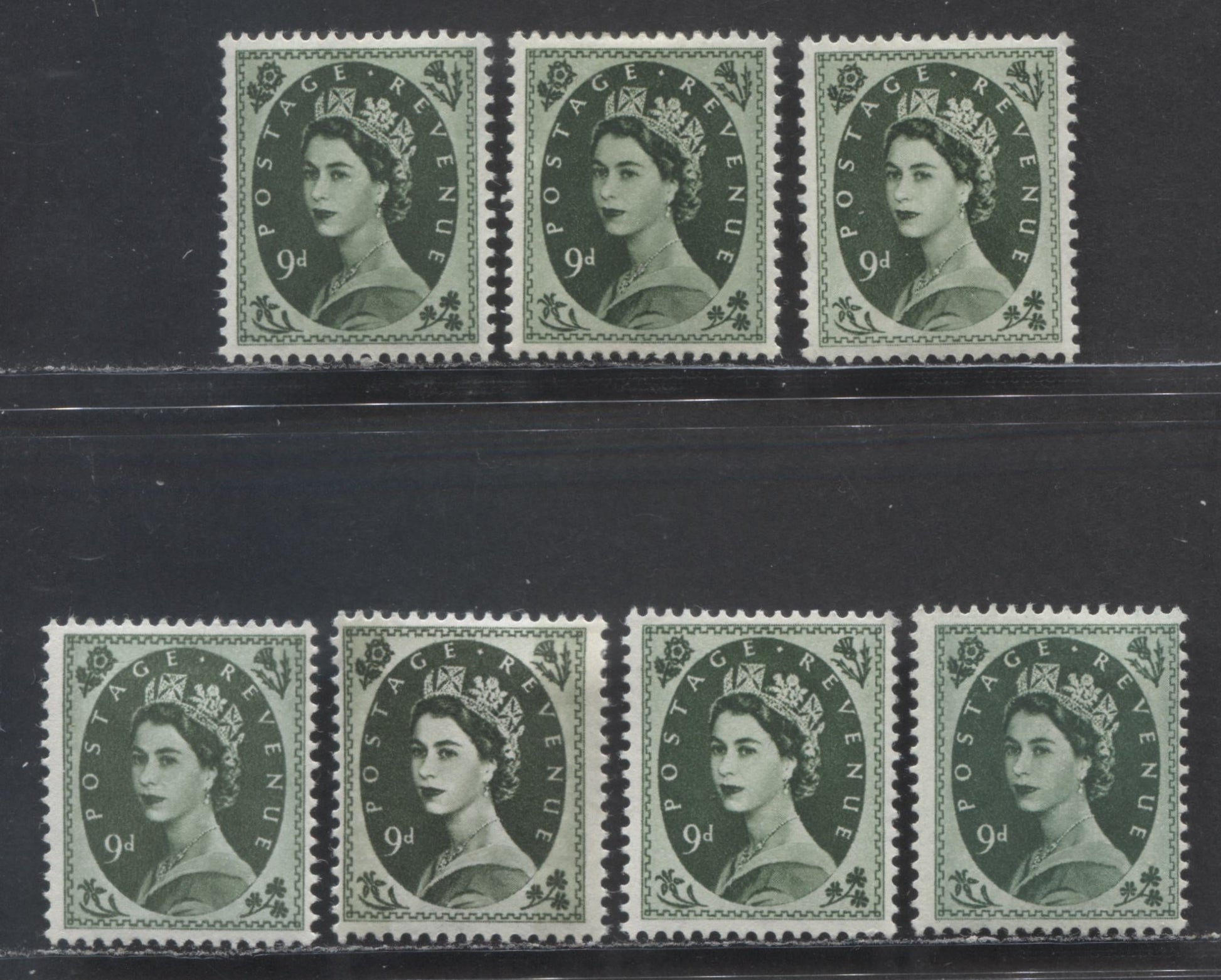 Great Britain SG#526/617c 9d Bronze Green 1952-1967 Wilding Issue, A Specialized Group of 7 Fine OG and VFOG Stamps, Including Two Shades Each of the Key Tudor and St. Edward's Crown Watermarks, Estimated Value $45
