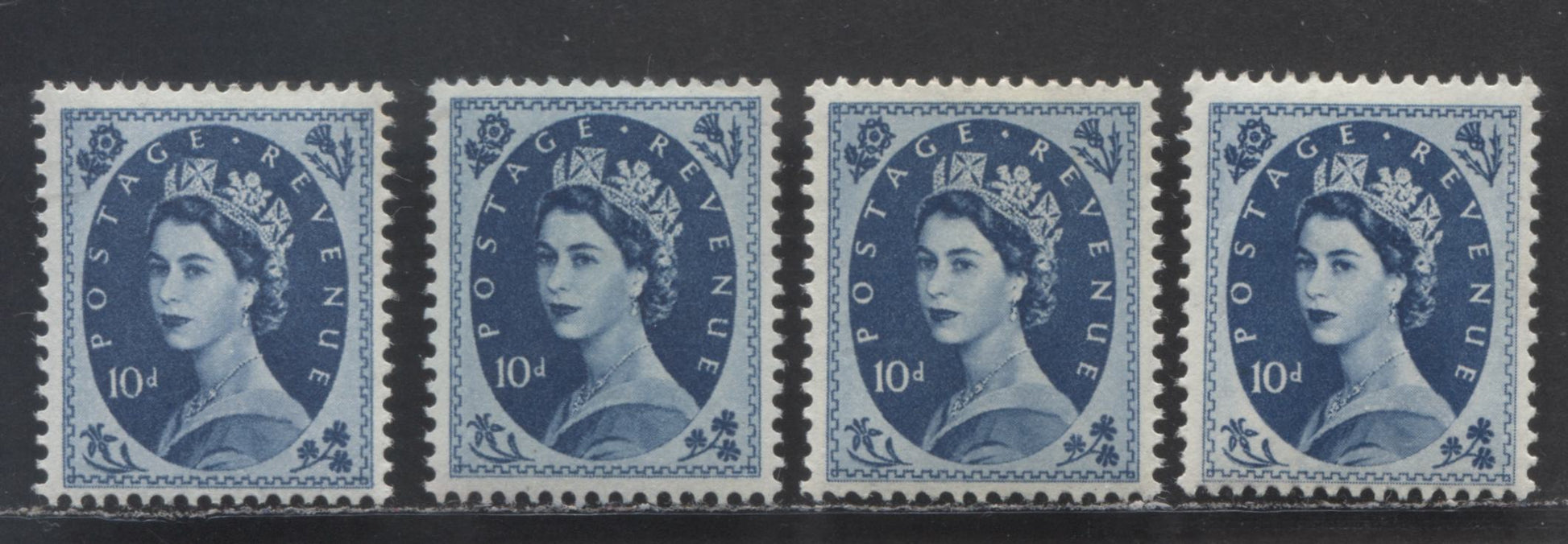 Lot 25 Great Britain SG#527/617d 10d Prussian Blue 1952-1967 Wilding Issue, A Specialized Group of 4 Fine OG and VFOG Stamps, Including Both the Key Tudor (2 Shades) and St. Edward's Crown Watermarks, Estimated Value $30