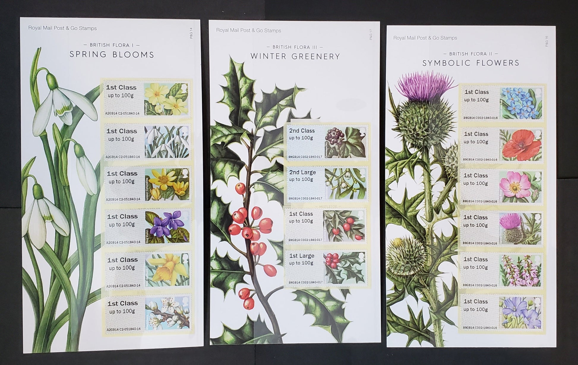 Lot 131 Great Britain SG#FS95/FS112b 2014-2015 British Flora Series 1-3, Post & Go, 3 VFNH Special Pack With Strips Of 6, Click on Listing to See ALL Pictures, Estimated Value $75.31 CDN