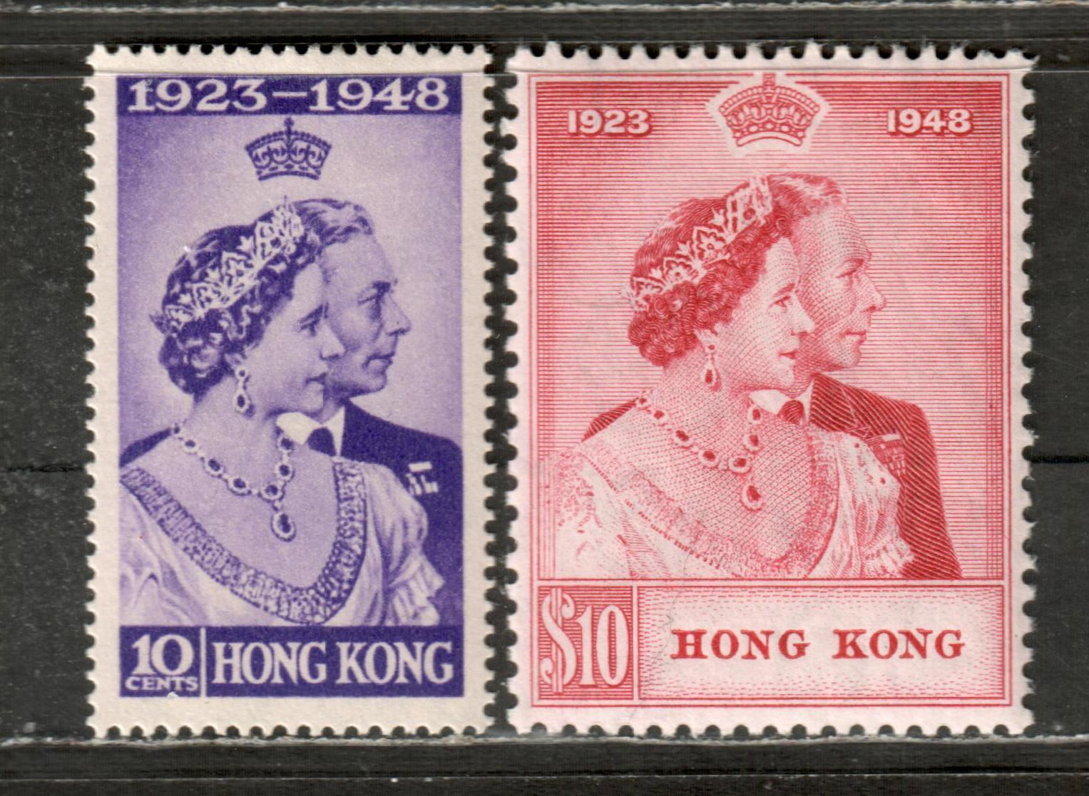 Lot 90 Hong Kong SG#171-172 10c Violet & $10 Carmine, 1948 Silver Wedding Issue, 2 VFOG Singles