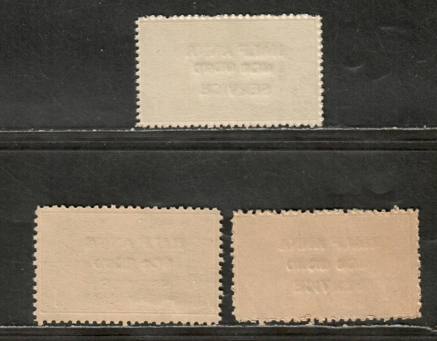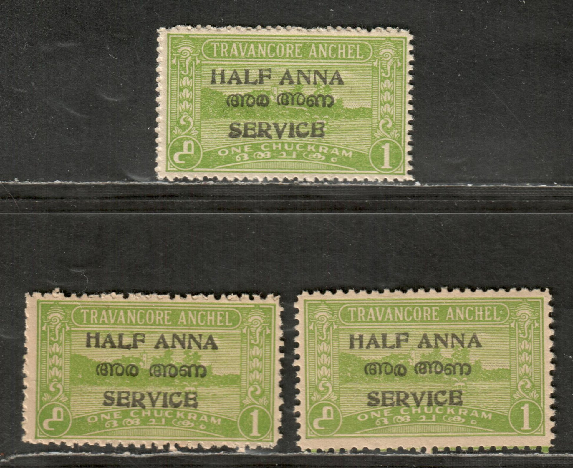 3 VFUN singles of the 1/2a on 1ch yellow green from the 1949-1952 Official "Service" Overprint On Travancore Maharaja's 27th Birthday Issue with various perfs and watermarks. Including:
