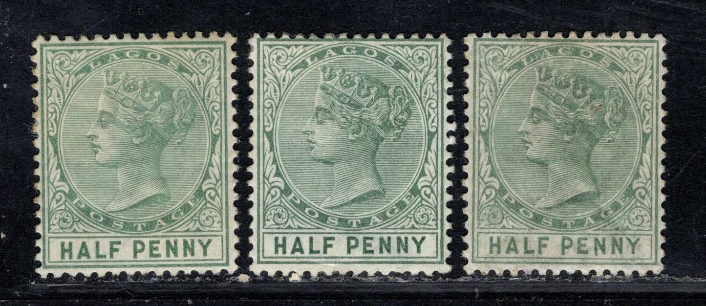 Lagos #21 1/2d Green Queen Victoria, 1884-1886 Queen Victoria New Color Keyplates Issue, 3 F/VFOG Singles Crown CA Wmk, De La Rue Printing, Plate 1 Printings, Different Shades