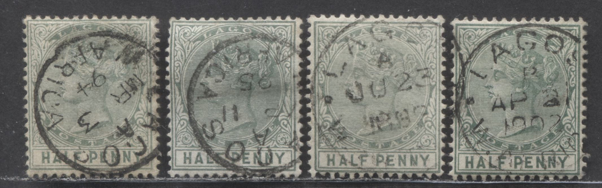 Lot 34 Lagos SC#13 1/2d Deep Dull Green, Dull Green & Dull Bluish Green 1884-1886 Colour Changes & New Values, Crown CA Watermark, Perf 14 Comb, Large CDS Cancellations, 4 Very Fine Used Examples, Estimated Value $100 USD