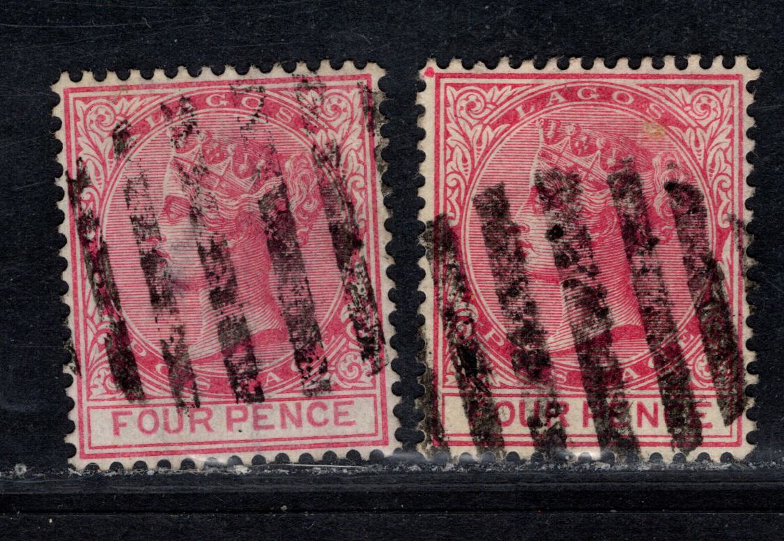 Lagos SG#14 4d Carmien Rose & Rose Queen Victoria, 1876-1879 Queen Victoria Keyplates Issue, 2 Fine/Very Fine Used Singles Crown CC Wmk, Comb Perf 14, November 1880 Printing