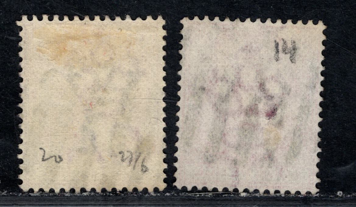 2 fine/very fine used singles of the 4d carmien rose & rose Queen Victoria from the 1876-1879 Queen Victoria Keyplates Issue crown cc wmk, comb perf 14, november 1880 printing.