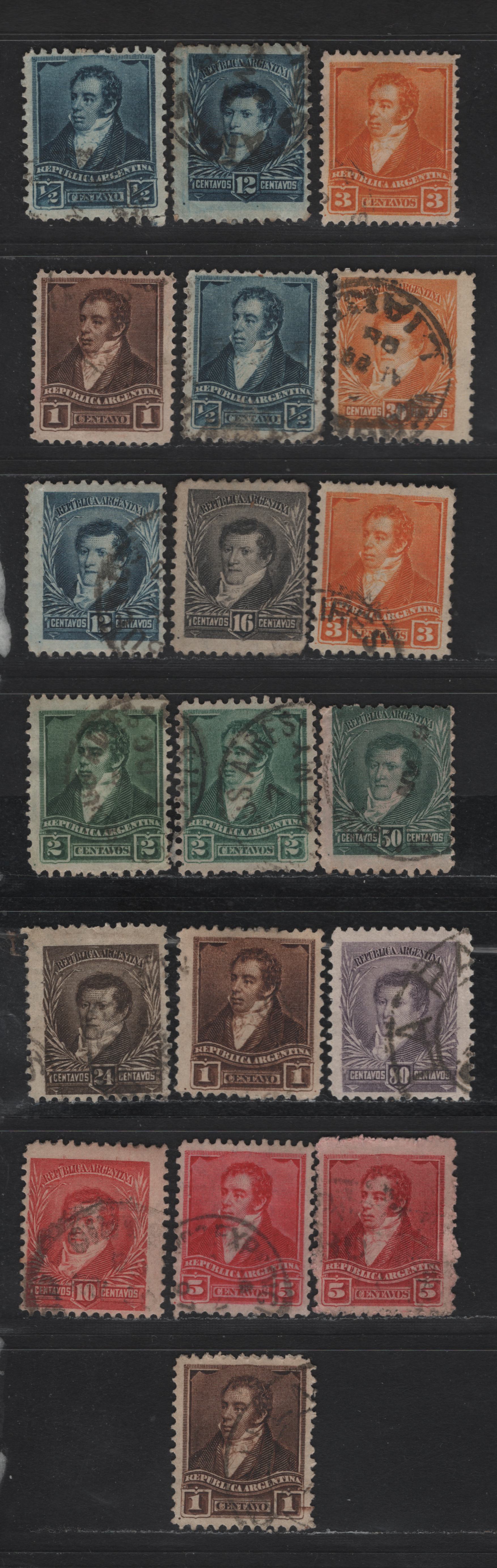 19 fine/very fine used singles of the 1/2c - 80c indigo - dull violet Rividavia, Belgreno & San Martin from the 1896-1897 Rividavia, Belgreno & San Martin Issue, perfs 11.5 & 12, large sun wmk.