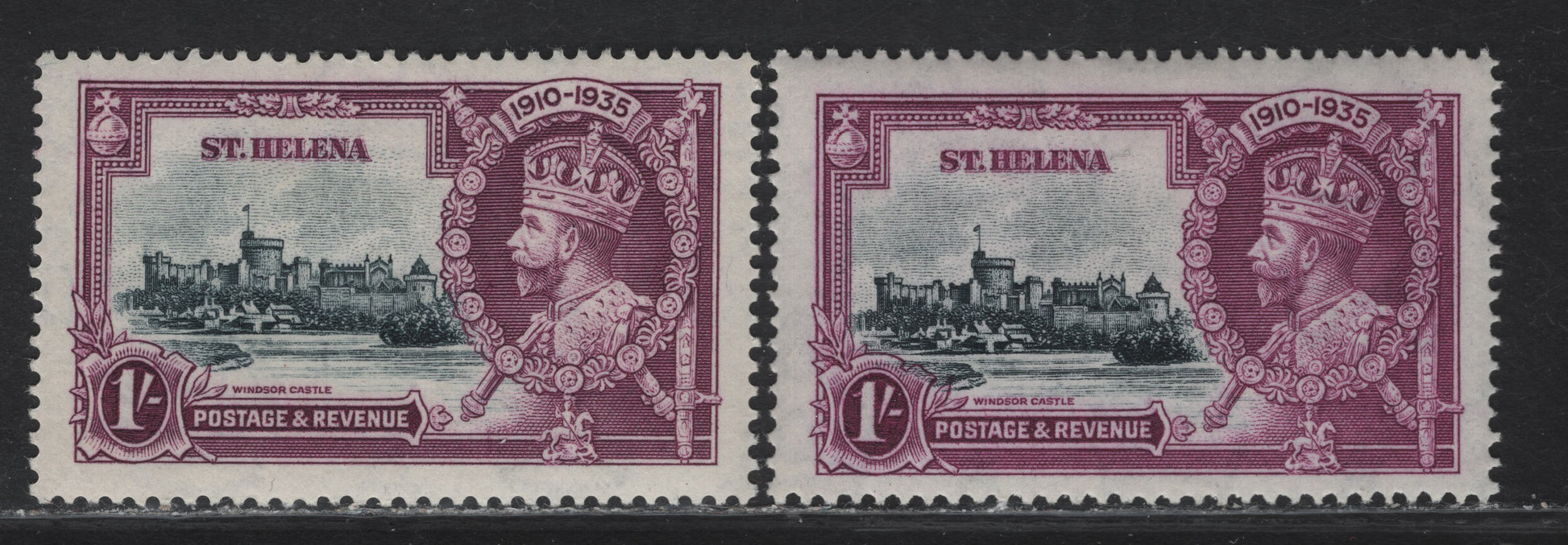 Lot 101 St Helena SG#127 1/- Slate & Purple/Bright Purple KGV & Windsor Castle, 1935 Silver Jubilee Issue, 2 VFOG Singles, Two Different Shades Of The Frame