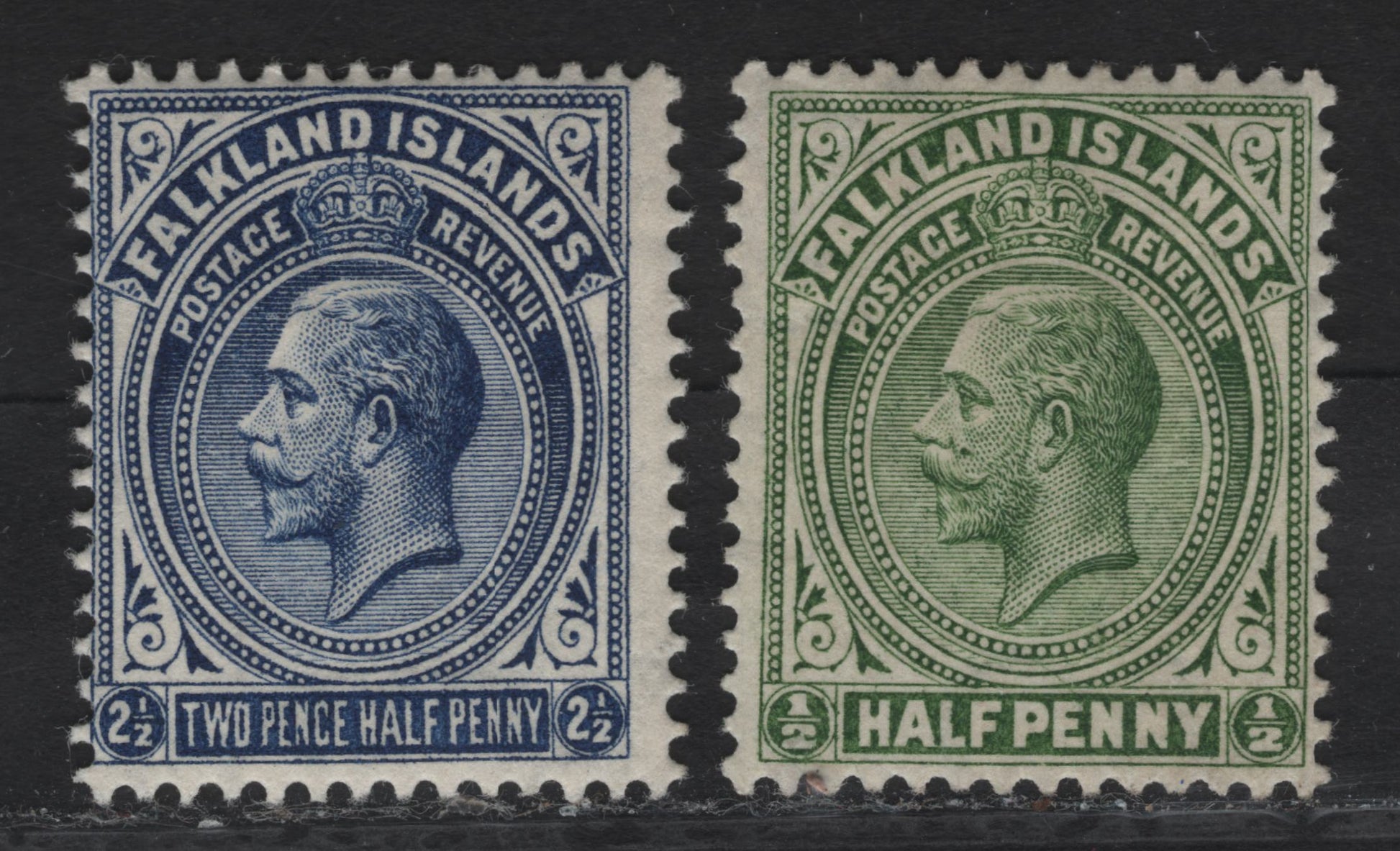 Lot 104 Falkland Islands SG#60, 63 1/2d - 2/5d Yellow Green - Deep Bright Blue King George V, 1912-1920 KGV Sidefaces Issue, 2 FOG Singles, Multiple Crown CA Wmk