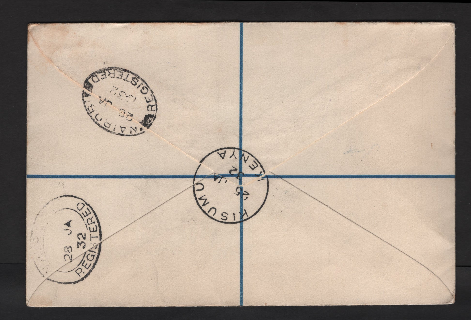 A very fine used cover of the 5c - 15c green - rose carmine King George V from the 1922-1927 KGV Keyplates, franked with block of 4 & single, Jan 25 1932 registered airmail cover, from Kisurnu to Nairobi.