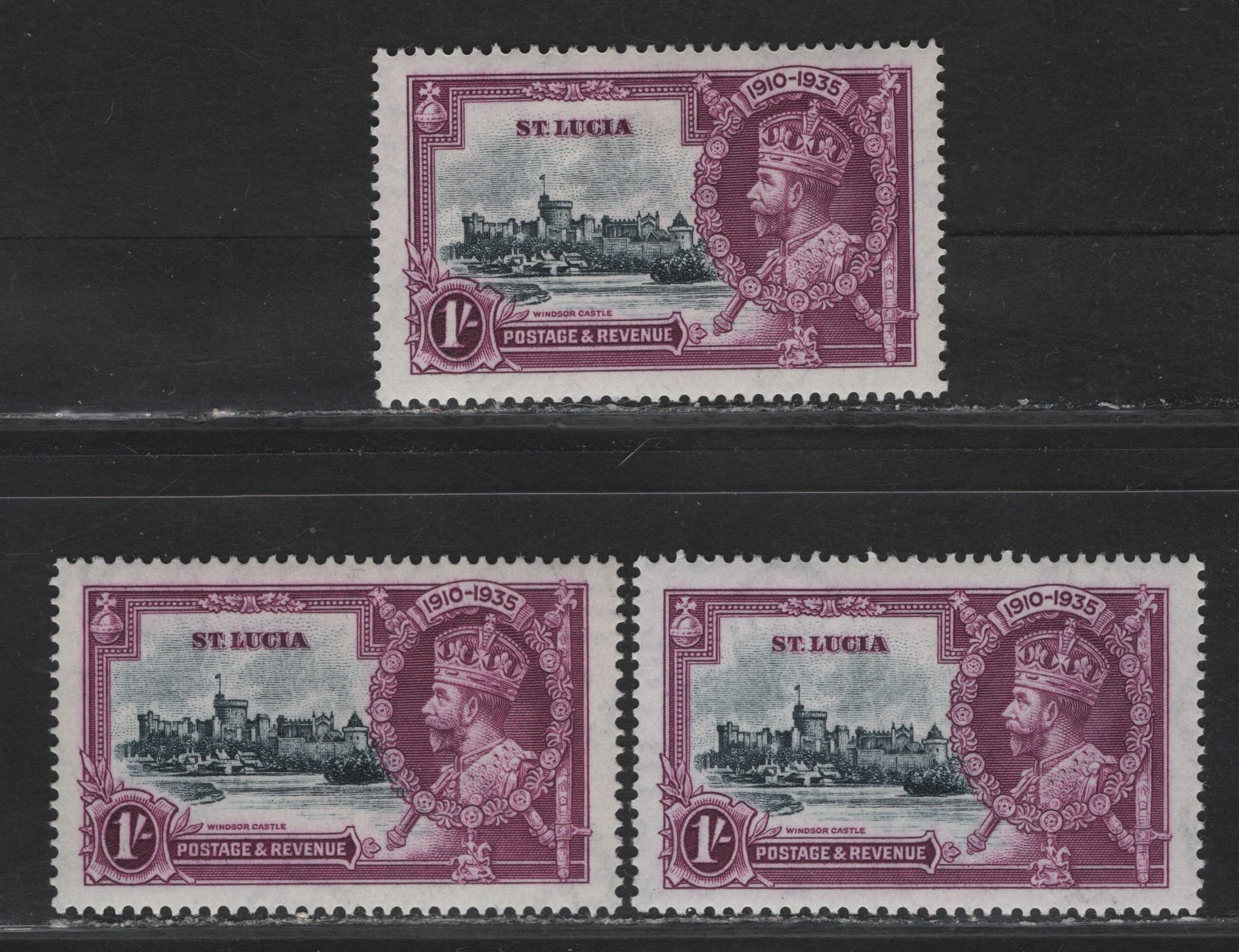 Lot 110 St. Lucia SG#112 1/- Slate/Bluish Slate & Bright Purple KGV & Windsor Castle, 1935 Silver Jubilee Issue, 3 VFOG Singles, Three Different Shades Of The Frame & Vignette Plates, Different Shades Than Lots 111 & 112