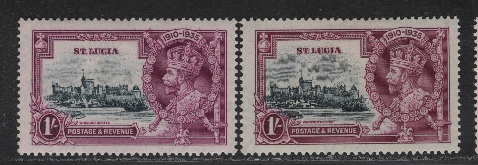 Lot 111 St. Lucia SG#112var 1/- Pale Slate & Bright Reddish Purple - Slate & Plum KGV & Windsor Castle, 1935 Silver Jubilee Issue, 2 VFOG Singles, Different Shades Than Lots 110 & 112