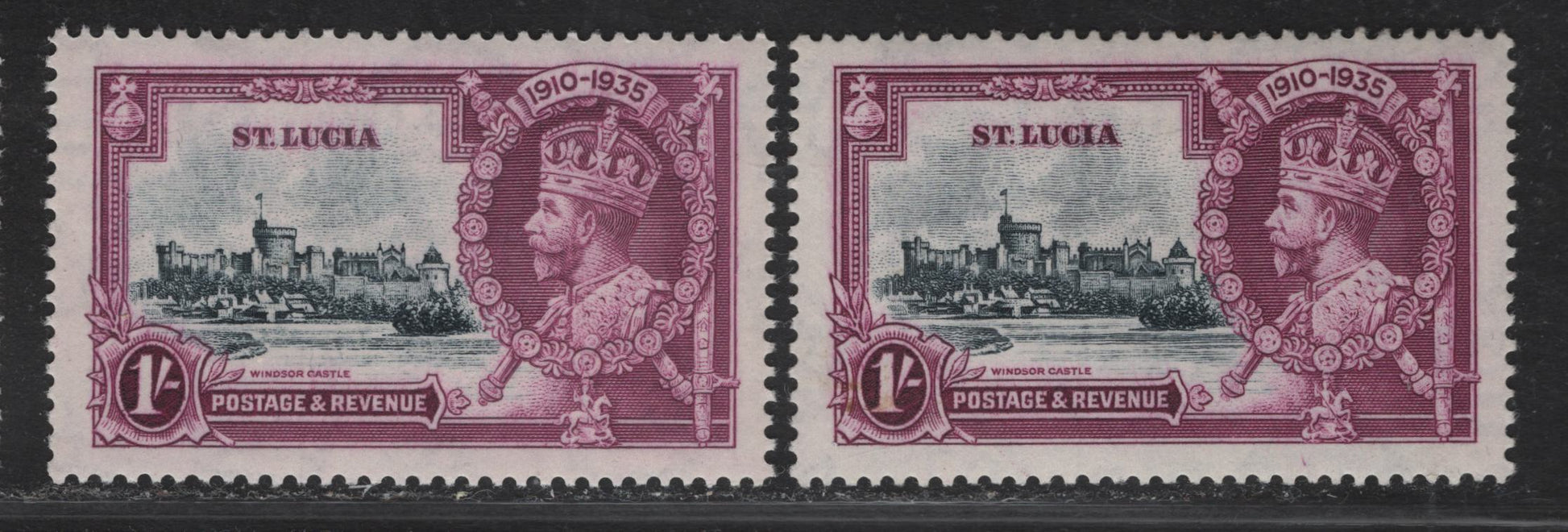 Lot 112 St. Lucia SG#112var 1/- Pale Slate & Bright Milky Rose Purple - Slate & Rose Purple KGV & Windsor Castle, 1935 Silver Jubilee Issue, 2 VFOG Singles, Different Shades Than Lots 110 & 111
