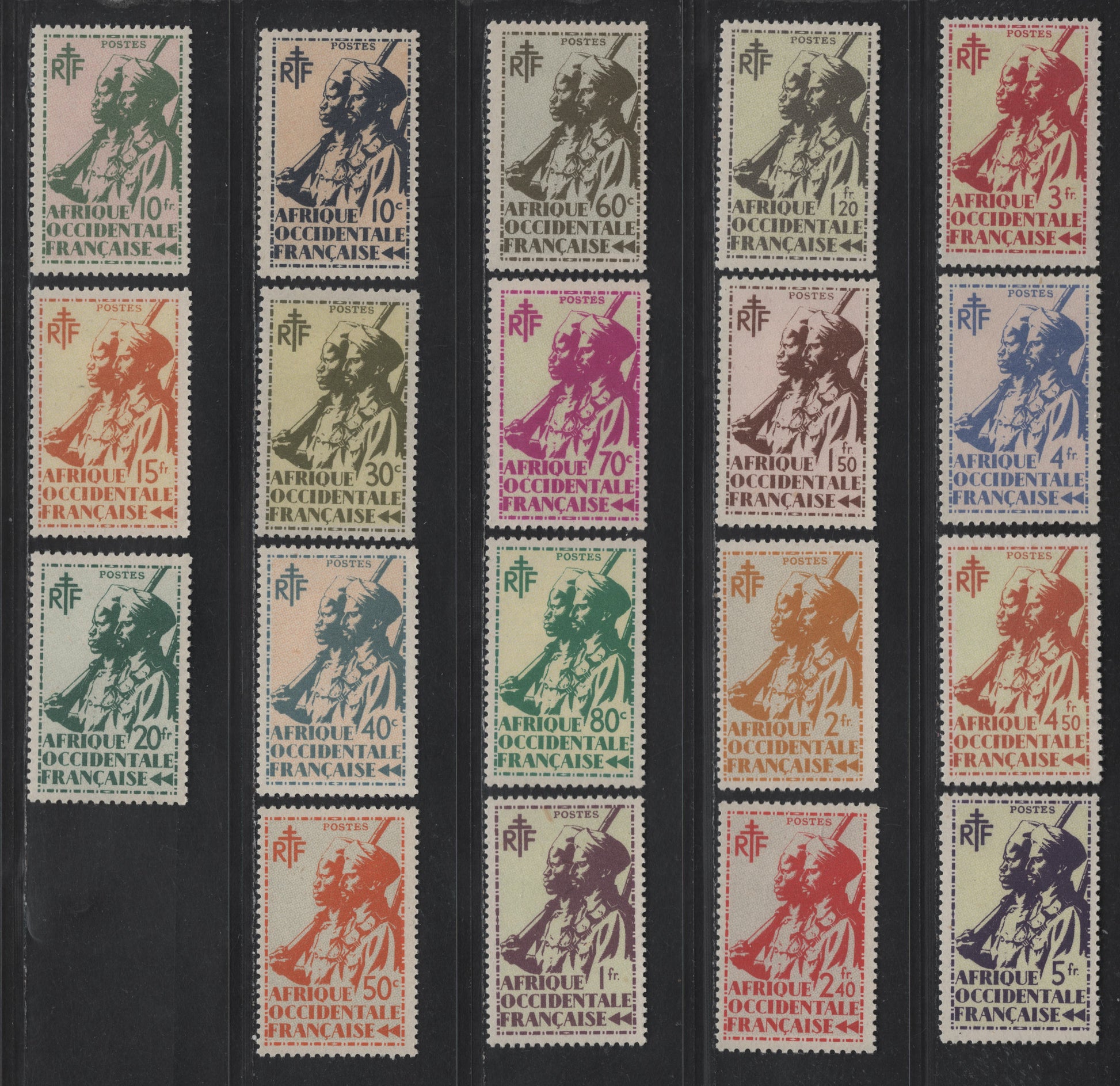 Lot 115 French West Africa SC#17-35 10c - 20fr Indigo & Buff - Slate Green & Greenish Colonial Soldier, 1945 Pictorial Issue, 19 VFOG Singles