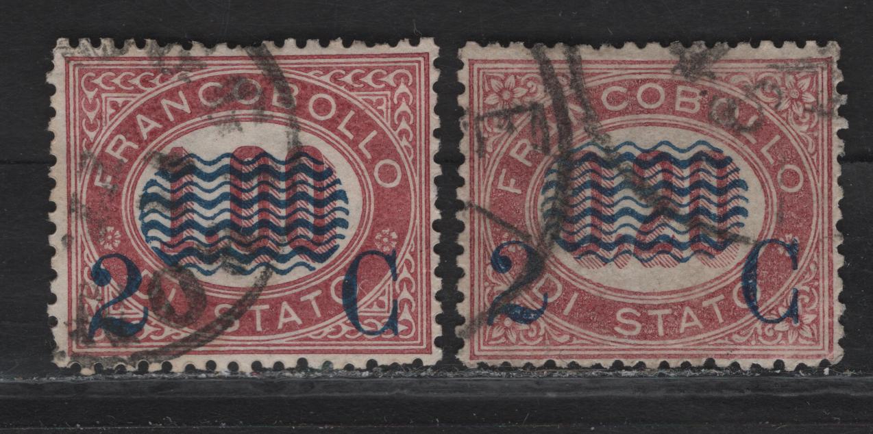 Lot 116 Italy SC#39, 41 2c on 20c - 2c on 1l Lake Waves, 1878 Official Surcharged Issue, 2 Very Fine Used Singles