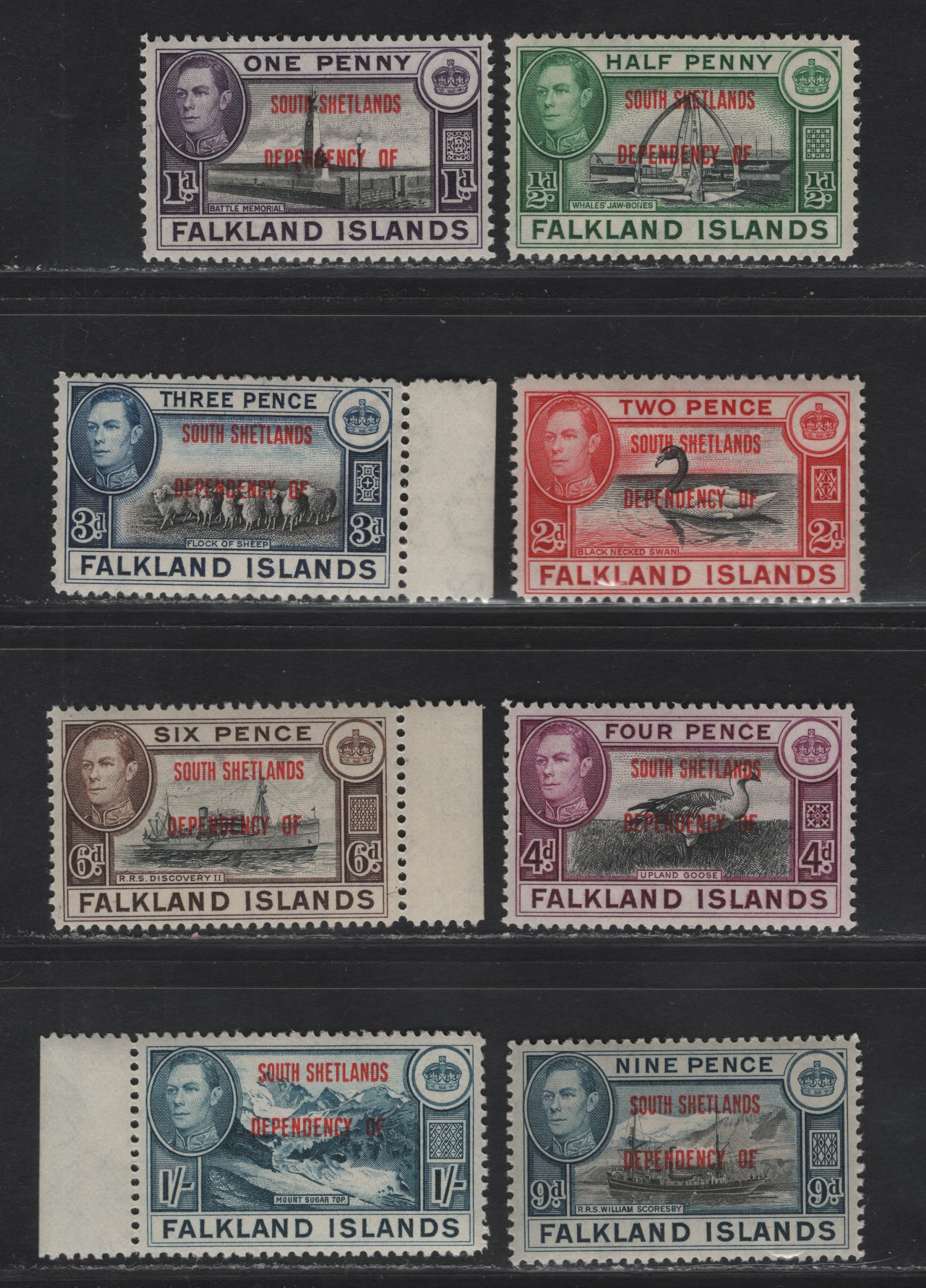 8 VFNH singles of the 1/2d - 1/- black & green - deep blue Whaltes Jawbone - Mount Sugar Top from the 1944-1945 KGVI Pictorial Overprints, south shetlands, basic set of overprints.