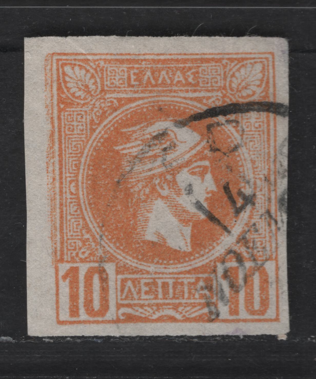 Lot 127 Greece SC#93a 10L Yellow Orange Hermes Head, 1891-1895 Small Hermes Head Issue, A Very Fine Used Imperf Single, Deformed Left Frameline, Athens Print