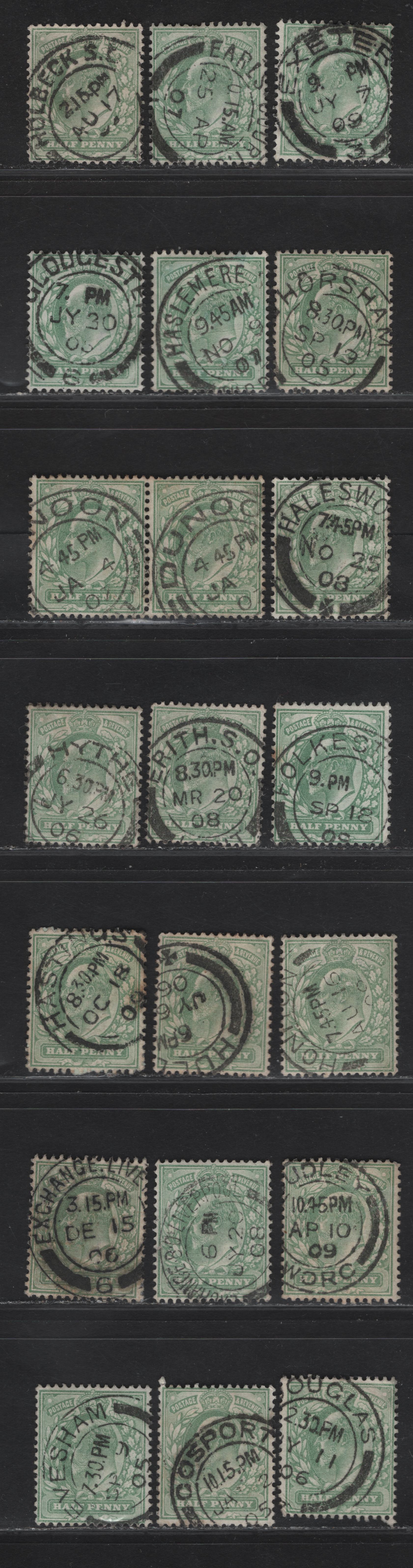 fine/very fine used singles of the 1/2d pale yellowish green - yellowish green King Edward VII from the 1902-1910 King Edward VII Issue, single bar barell CDS cancels, d-h towns & villages.