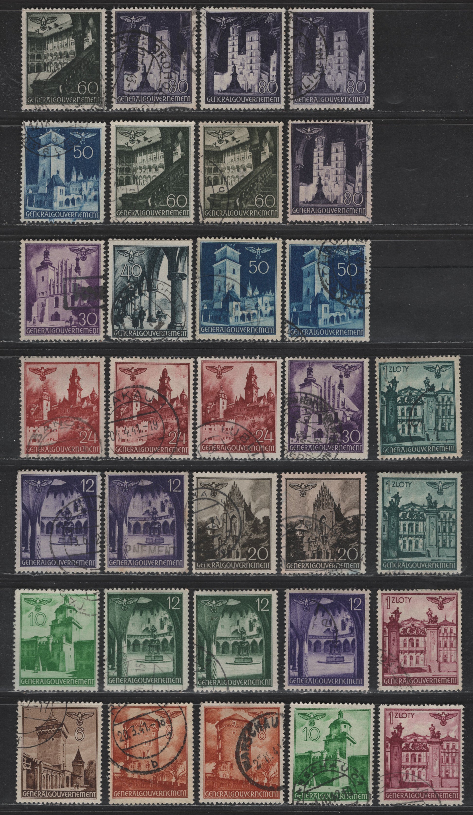 Lot 132 Poland - German Occupation SC#N56-N57, N59-N64, N66, N68-N72 6g - 1z Brown - Prussian Green Buildings, 1940-1942 Pictorial Definitives, 32 Fine/Very Fine Used Singles, Postally Used, Shade Variations