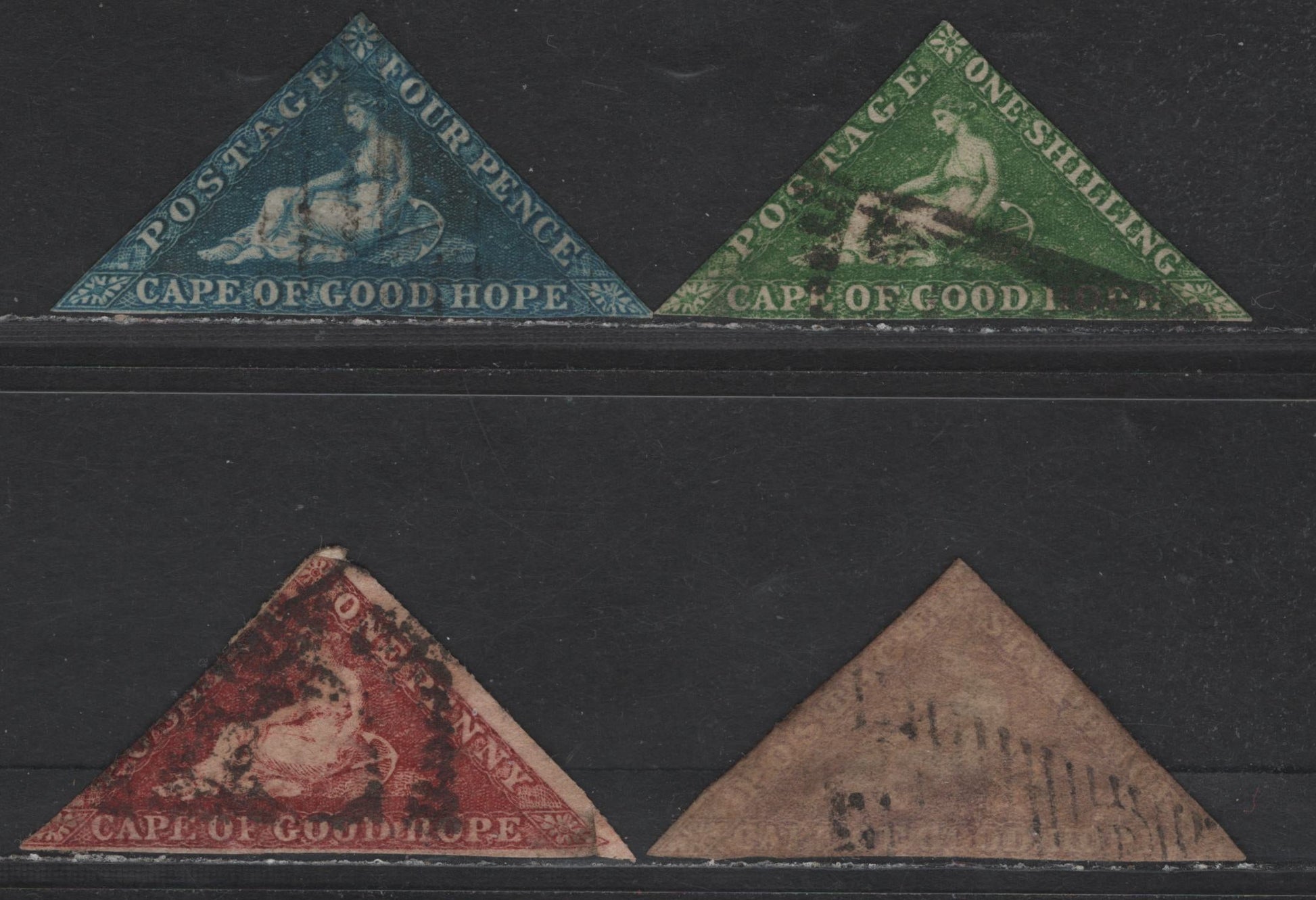 Lot 141 Cape Of Good Hope SG#6-8, 18 1d - 1/- Deep Carmine Red - Bright Yellow Green Reclining Hope, 1855-1864 Triangular Reclining Hope Issues, 4 Ungraded Singles, White Paper, Perkins Bacon & De la Rue Printings, All With No Margins Or Small Faults