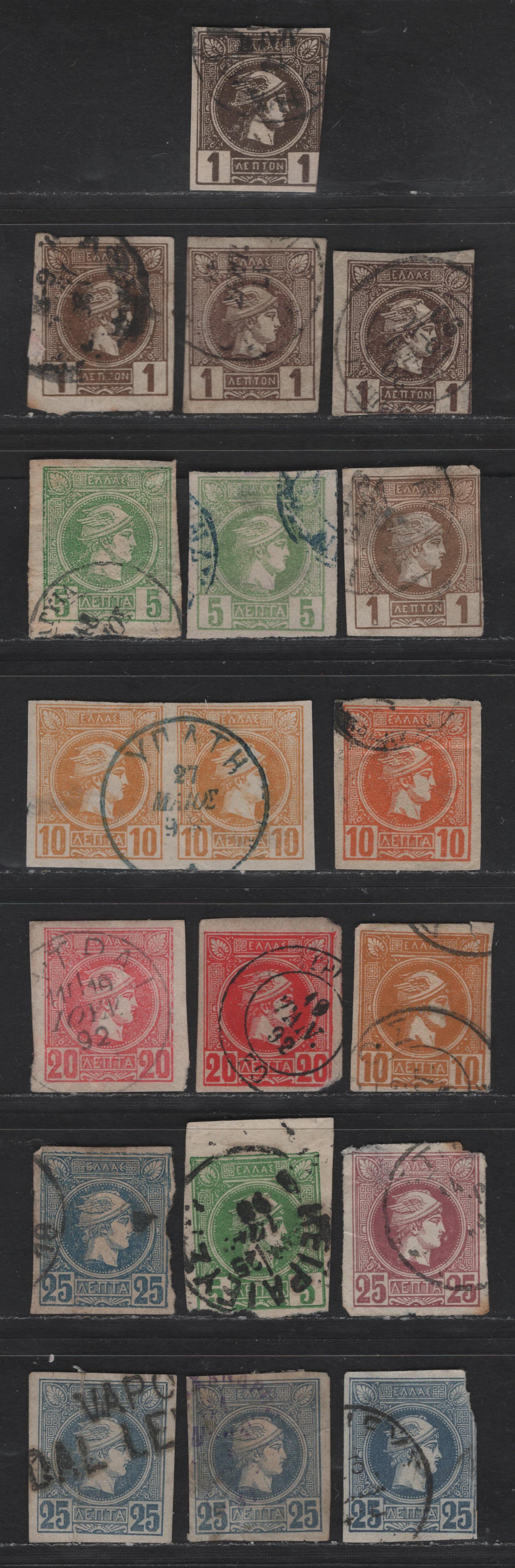 Lot 143 Greece SC#90a, 92, 92b, 93-a, 94-a, 95-96 1L - 25L Brown - Red Violet Hermes Head, 1891-1895 Small Hermes Head Issue, 18 Ungraded Imperf Singles, Study Lot, Faulty Examples With Duplication