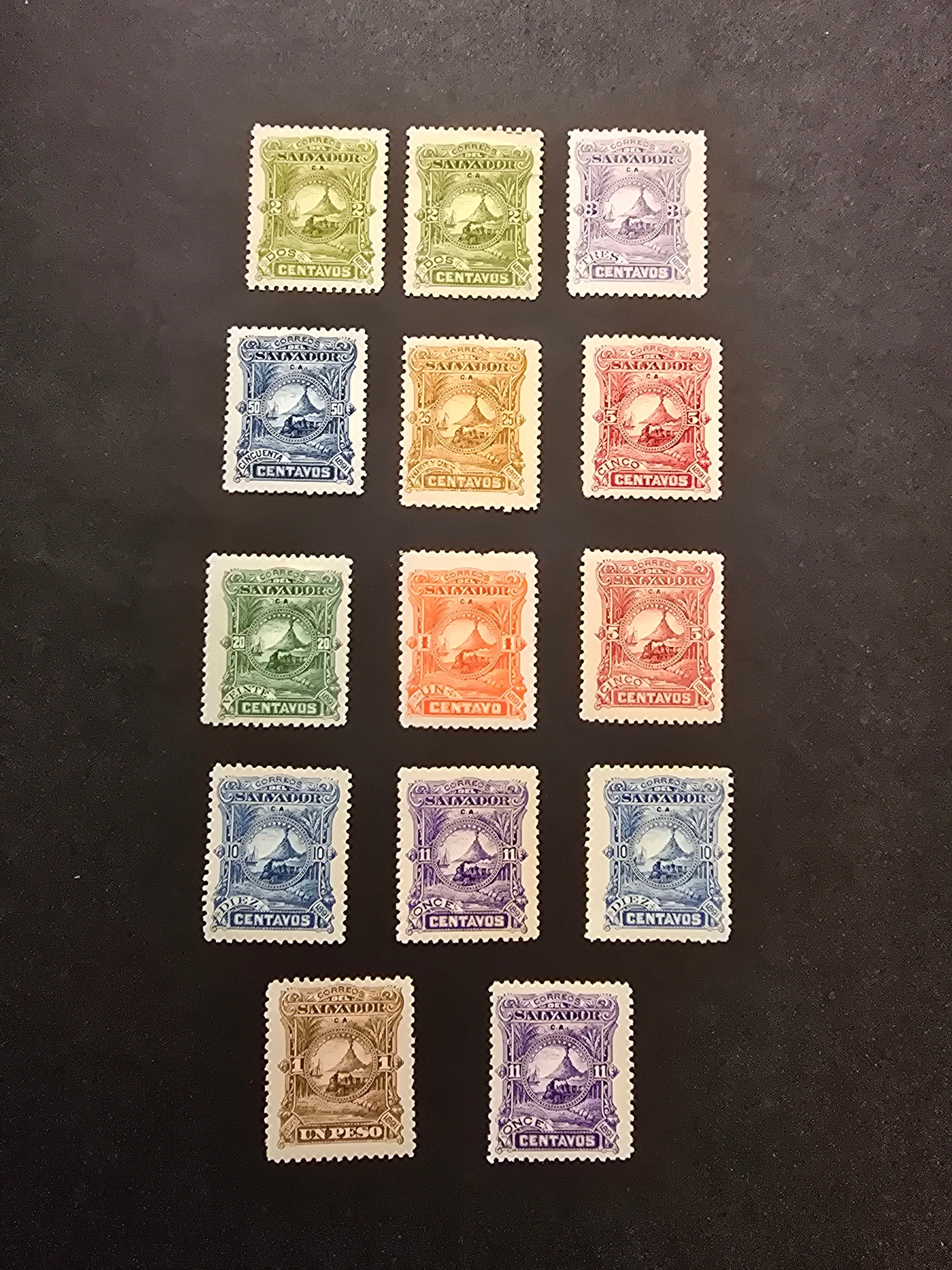 Lot 143 El Salvador SC#47-56 2c - 1p Green - Brown Arms, 1891 Arms Seebeck Issue, 14 F/VFOG Singles, Additional Shades