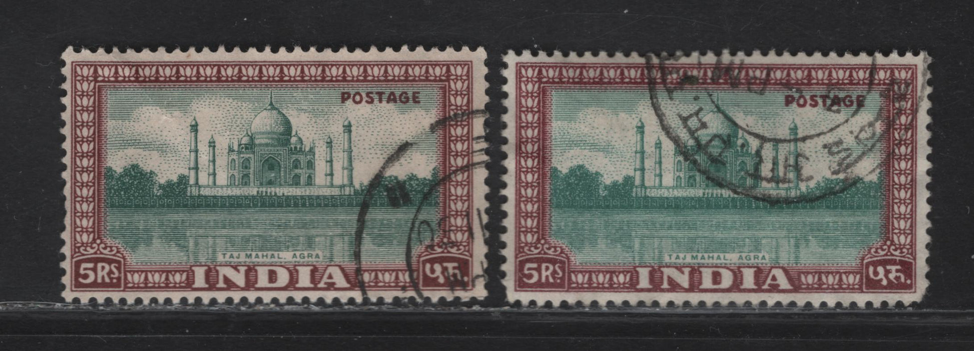 Lot 145 India SG#322, 322var 5r Blue Green & Claret - Deep Blue Green & Claret Taj Mahal, Agra, 1949-1952 Pictorial Issue, 2 Very Fine Used Singles