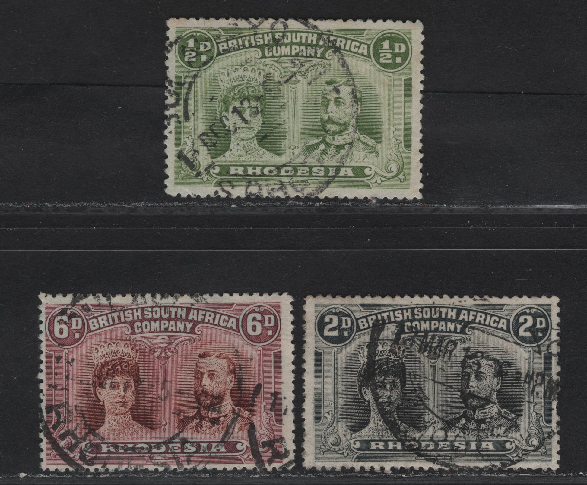 Lot 147 (C) Rhodesia SG#121, 129, 144 1/2d - 6d Olive Green - Red Brown & Mauve King George V, 1910-1913 Double Heads Issue, 3 Very Good/Fine/Very Fine Used Singles, Perf 14
