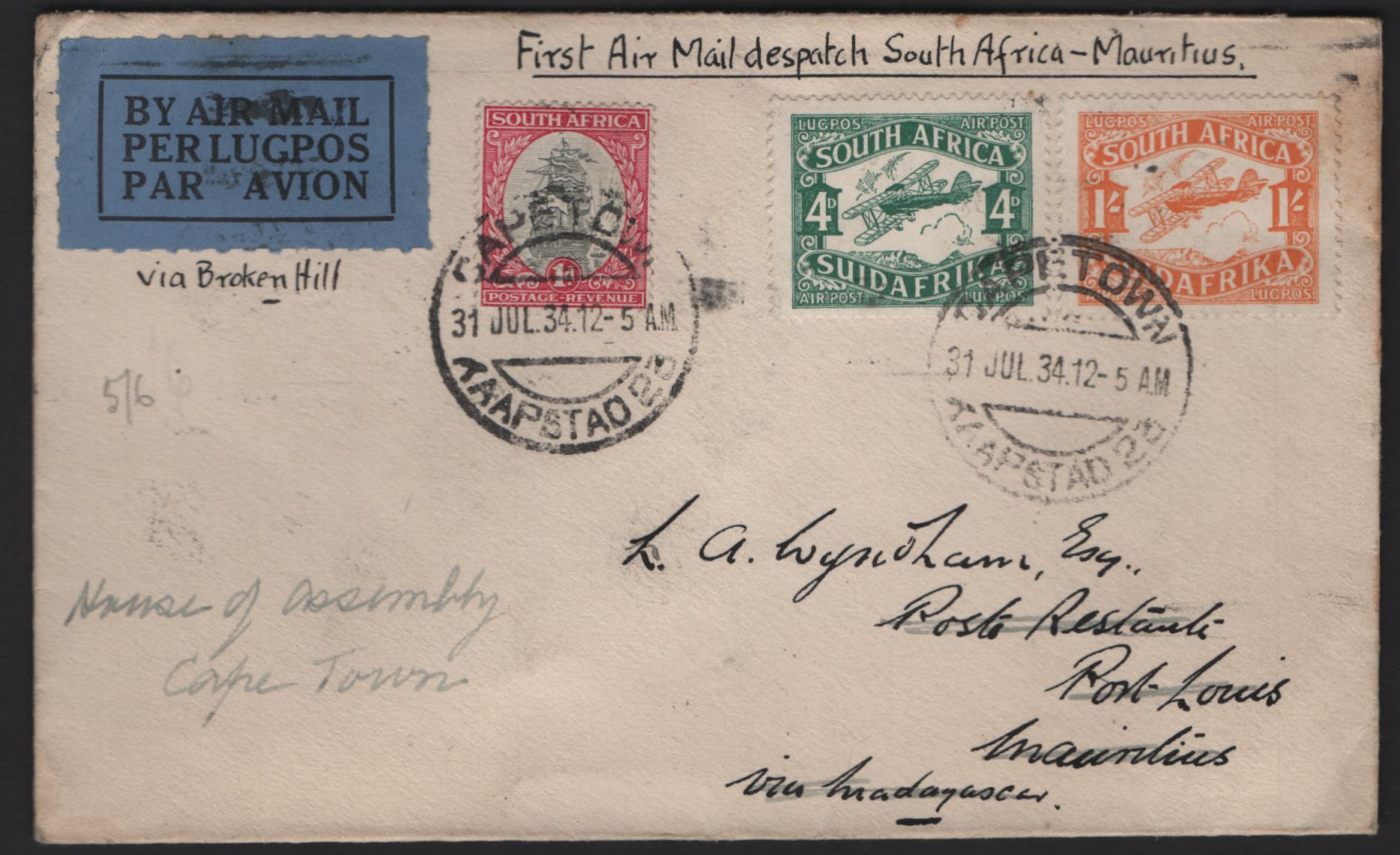 A very fine used cover of the 4d - 1d green - carmine & gray Van Reebecks Ship - Airplane from the 1926-1929 Pictorial & Airmail Issues, franked with 3 singles, first flight cover from South Africa to Mauritius via Madagascar.