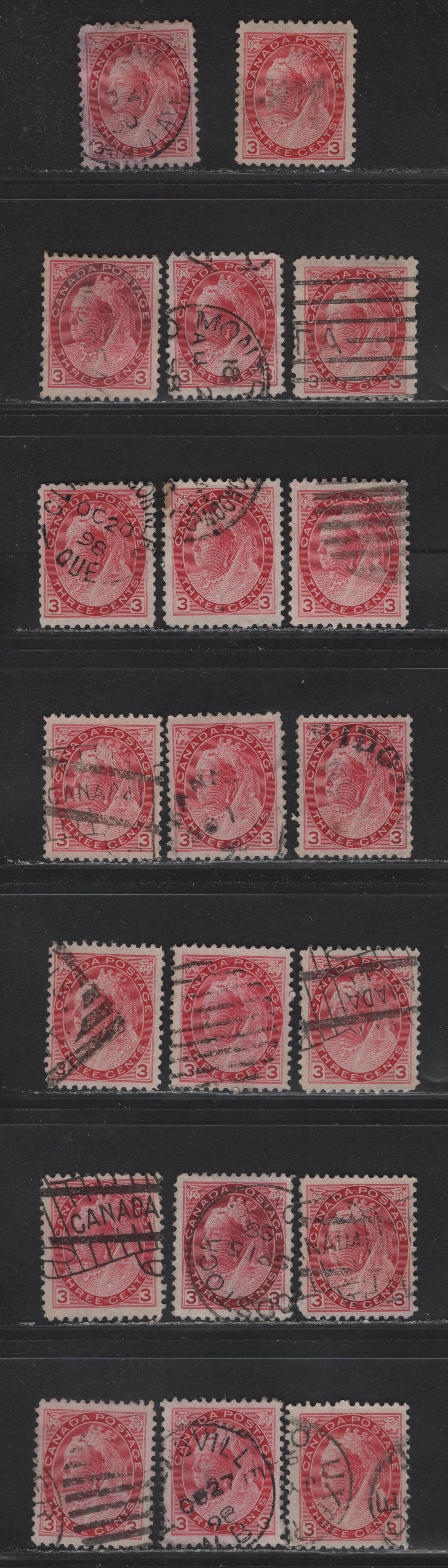 Lot 151 (C) Canada #78 3c Carmine Shades, 1898-1902 Queen Victoria Numeral Issue, 20 VF Used Singles On Different Papers, As Described Into My Detailed Table. See What you Can Make Of Them. Various Perfs