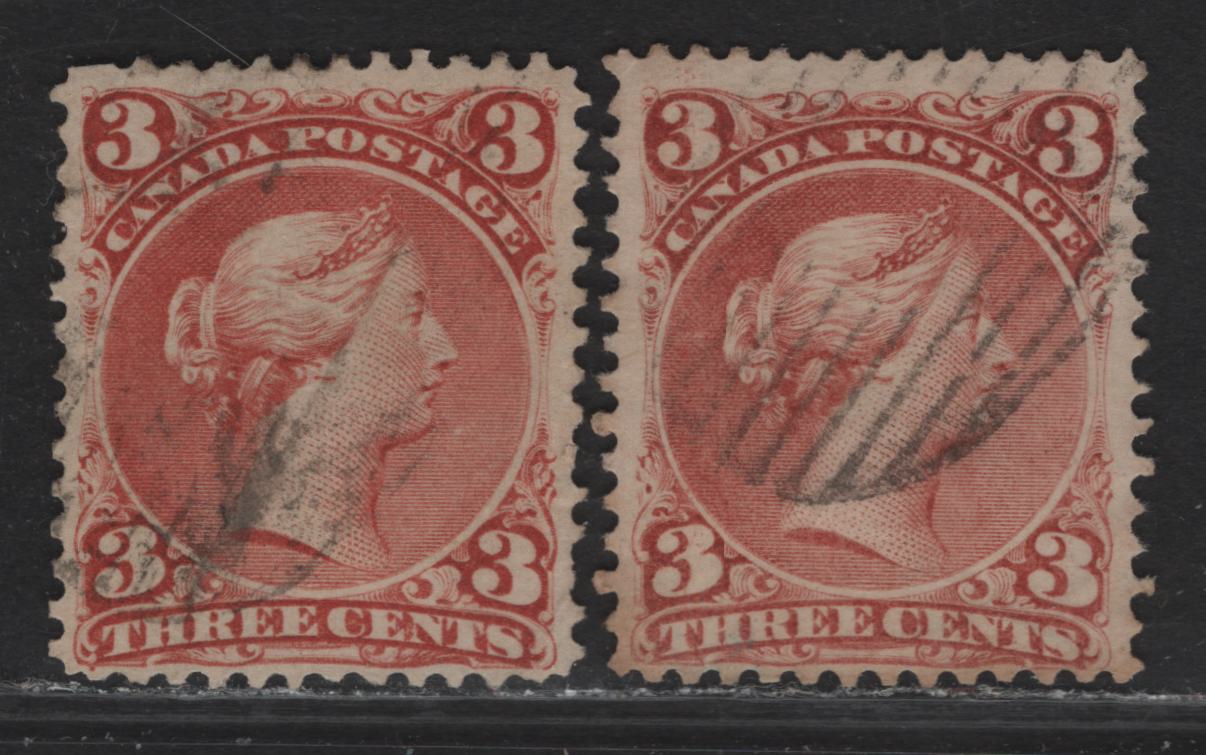 Lot 17 (C) Canada #25ii 3c Deep Rose Red - Deep Copper Red Queen Victoria, 1868-1876 Large Queen Issue, 2 Very Good/Fine Used Singles, Papers FO-O (Duckworth 4), Perfs 12x11.9 & 11.8x12, Guide Dot under LL Scroll.