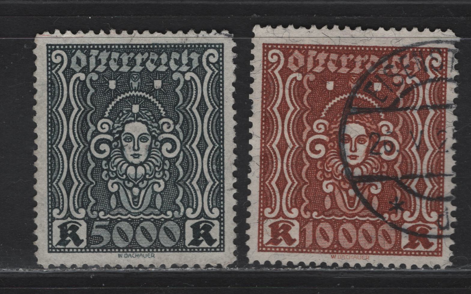 Lot 170 Austria SC#297a, 298 5000k - 10,000k Deep Gray Black - Red Brown Symbols, 1922-1924 Symbols of Art & Science Issue, 2 Very Fine Used Singles, Wet Printings, 25x29.5mm Designs