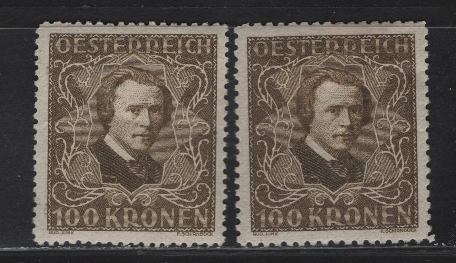Lot 179 Austria SC#B56-B56a 100k Brown Olive Hugo Wolf, 1922 Composers Semi Postal Issue, 2 VFOG Singles, Perfs 11.5 & 12.5