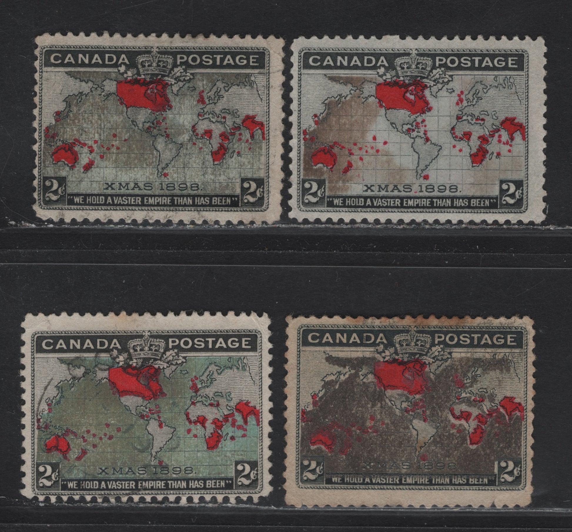 4 good/very good/fine used singles of the 2c lavender, aniline red & black - light prussian blue, aniline red & black Mercator's Projection from the 1898 Imperial Penny Postage Issue, all with muddy oceans.