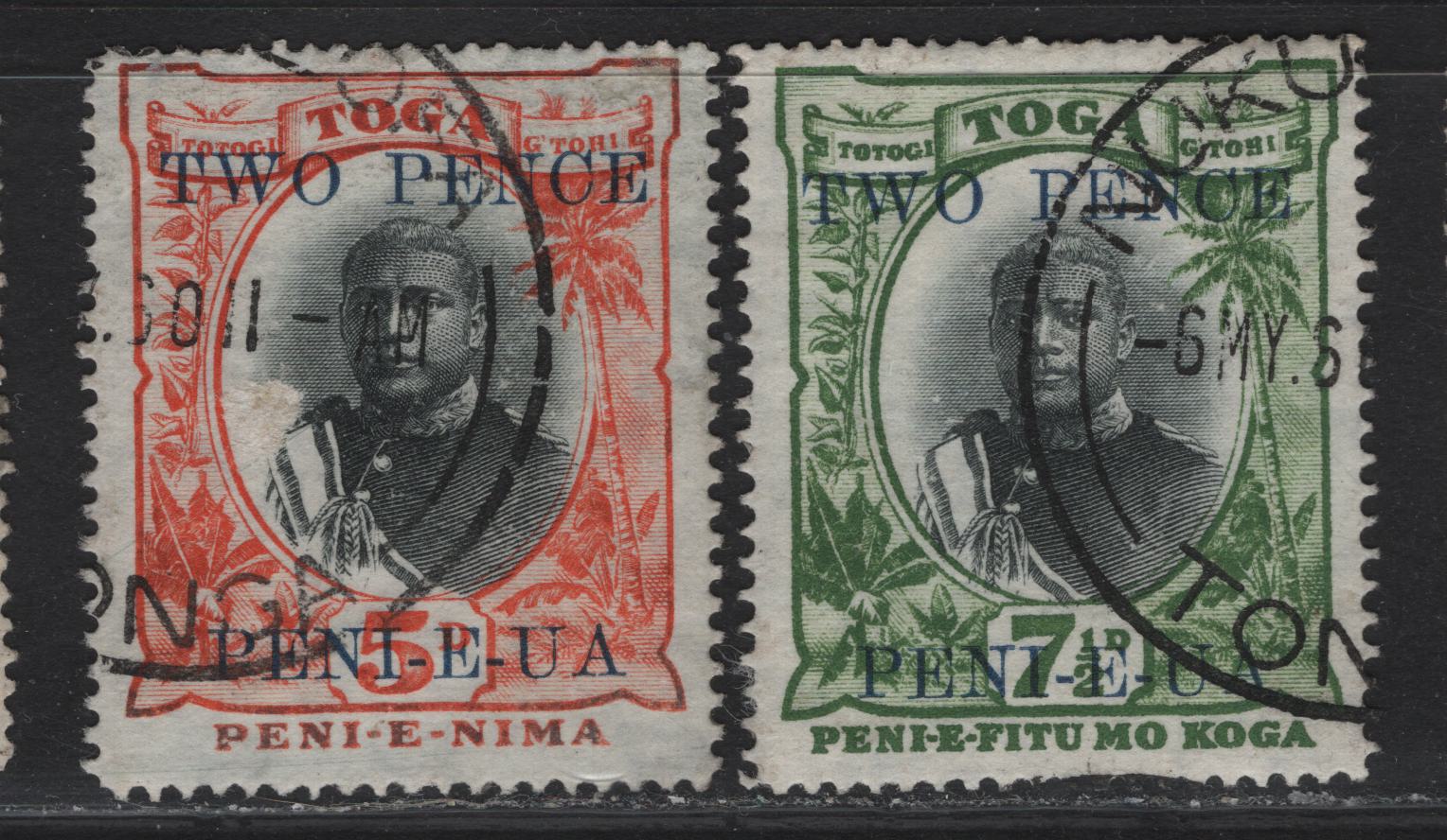 Lot 190 (C) Tonga SG#64-65 2d on 5d - 2d on 7.5d Black & Orange - Black & Green King George II -View of Haapai, 1923-1924 Surcharged Issue, 2 Fine/Very Fine Used Singles
