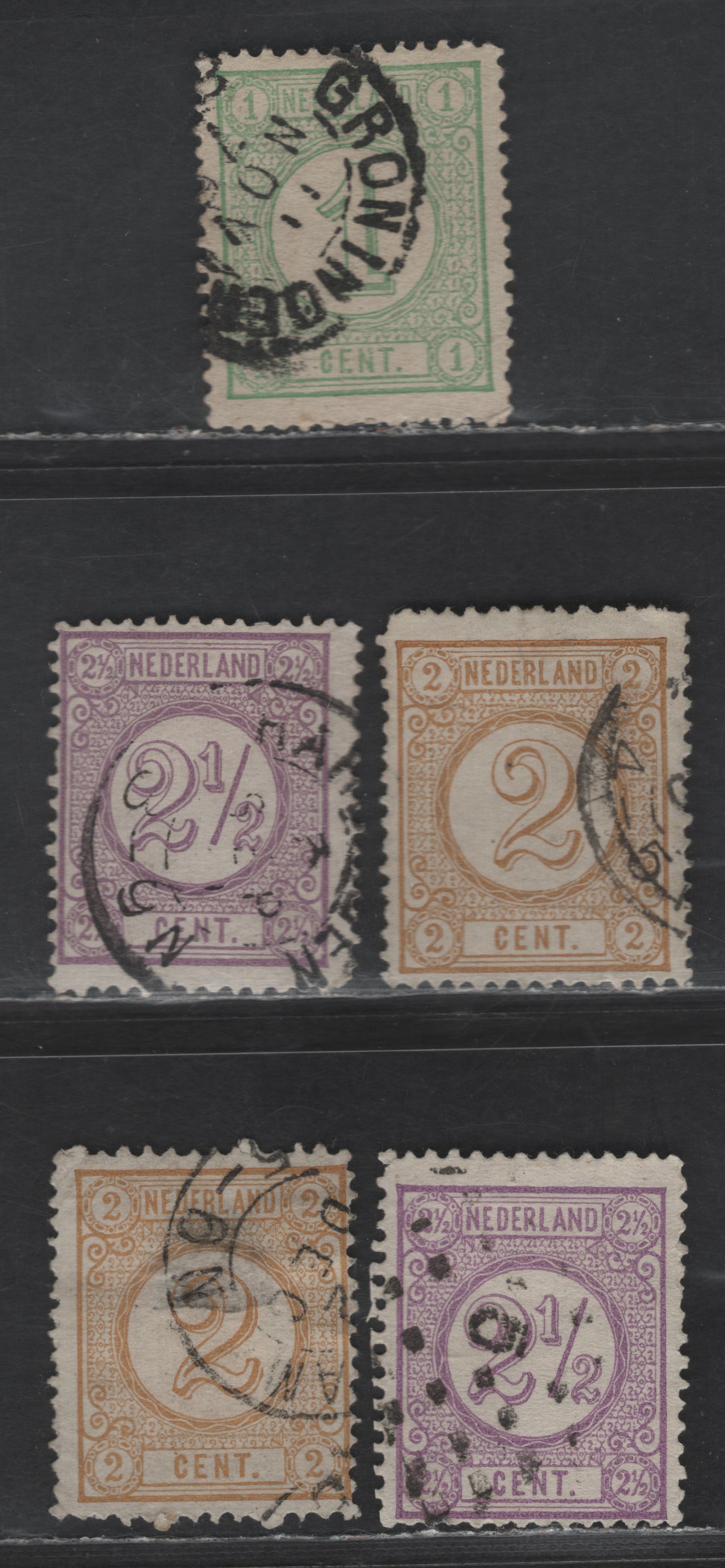 Lot 191 Netherlands SC#35c, 36a, 37, 37c (NVPH 31B, 32B, 33B) 1c - 2.5c Green - Lilac & Violet Numerals, 1876-1894 Numeral Issue, 5 Fine Used Singles, Perf 13.5x13.25, Large Holes