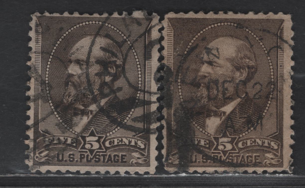 Lot 192 (C) United States Of America SC#205 5c Brown & Grey Brown James Garfield, 1879-1882 American Bank Note Large Banknote Issue, 2 VG & Fine Used Singles