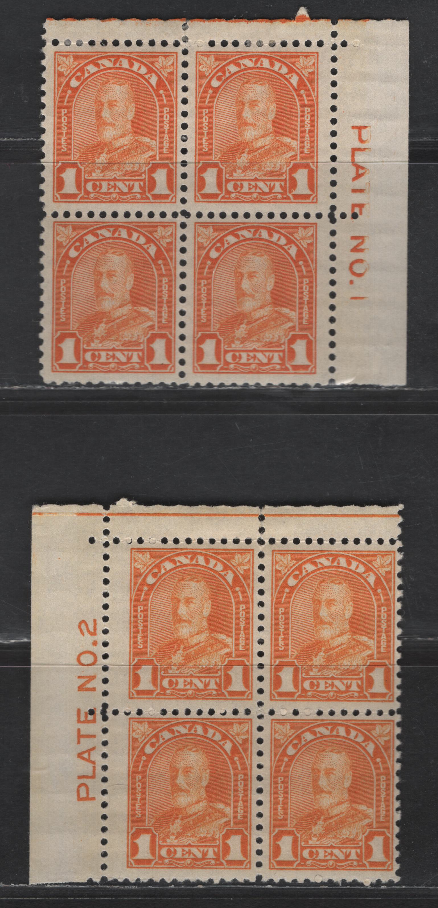 Lot 2 (C) Canada SC#162 1c Orange King George V, 1930-1931 Arch/Leaf Issue, 2 FOG Blocks Of 4, Plates 1 & 2