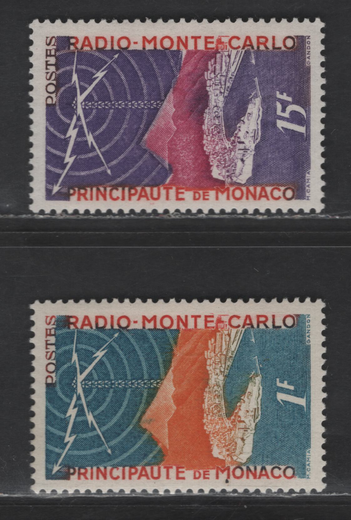 Lot 202 Monaco SC#280-281 1fr - 15fr Blue, Carmine & Orange - Purple, Carmine & Rose Violet Radio Monte Carlo, 1951 Radio Monte Carlo issue, 2 VFOG Singles