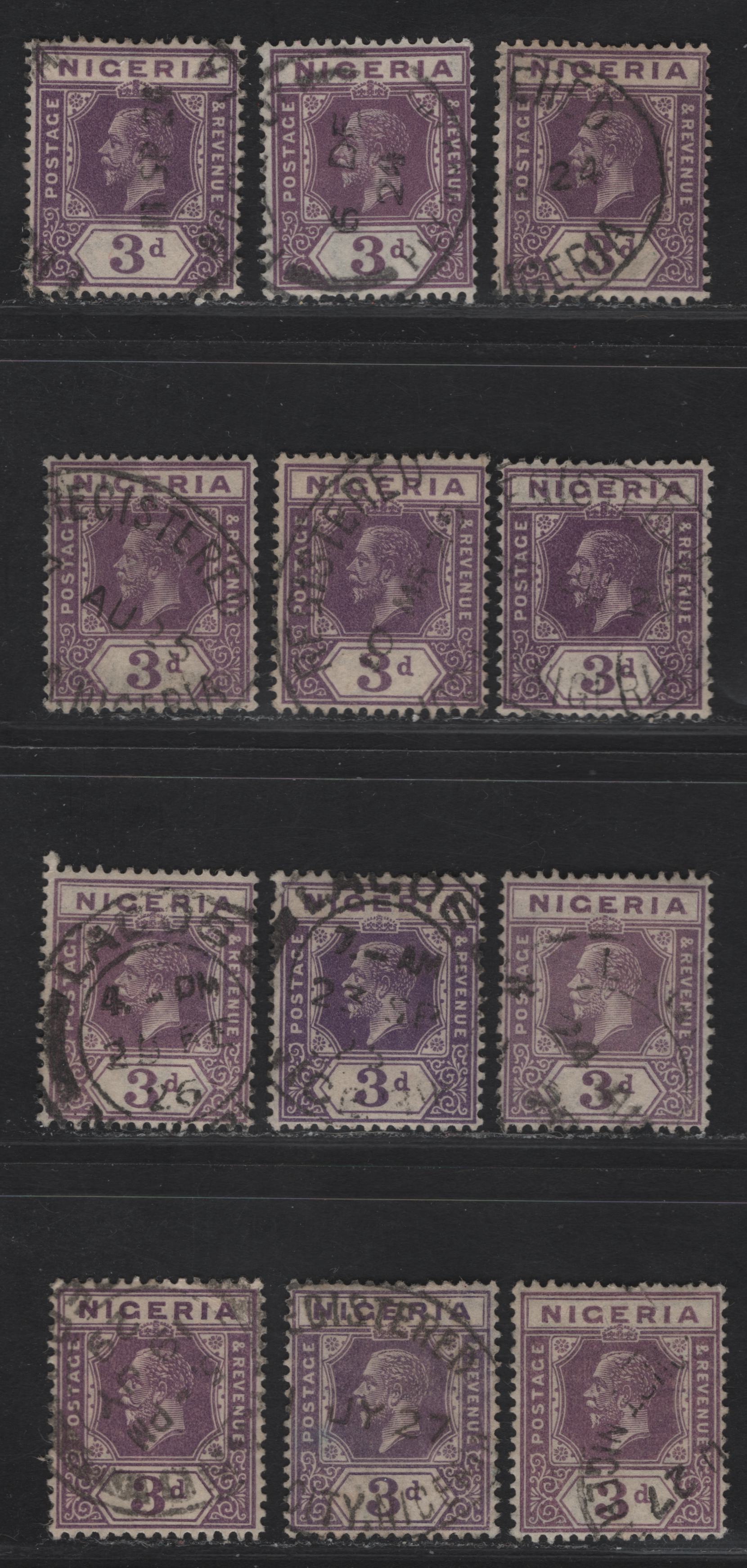 Lot 205 Nigeria SG#22-a 3d Purple & Purple Violet King George V, 1921-1932 KGV Imperium Keyplate Issue, Wmk Multiple Script CA, 12 Fine/Very Fine Used Singles, Dies 1 & 2, Dated Exampes With A Range Of Dates From 1924-1929