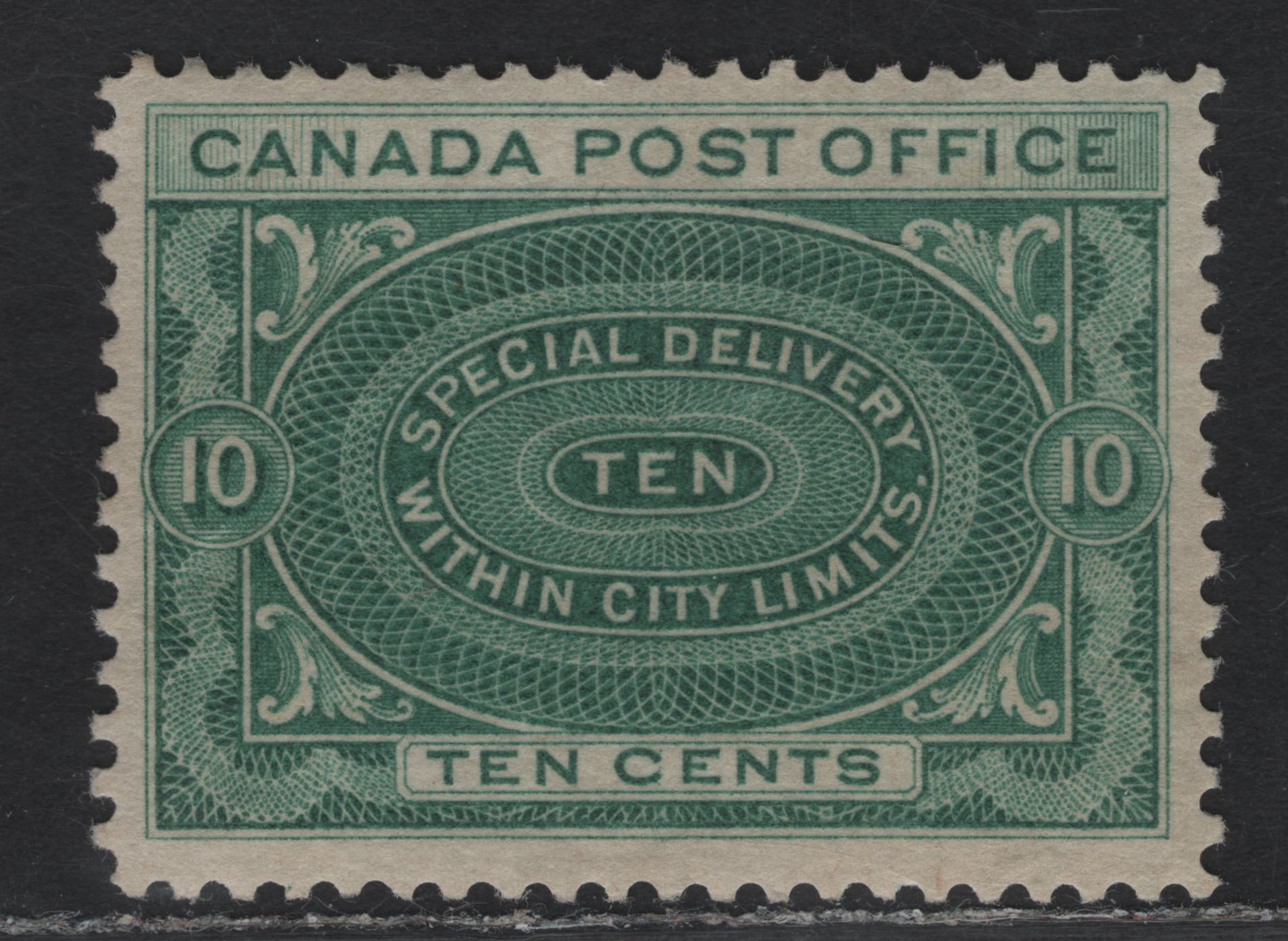 Lot 208 (C) Canada #E1 10c Bluish Green Special Delivery, 1898 Special Delivery Issue, A FOG Single, Paper ABN-L, Perf 12, Design Size 31.75x22.75mm.