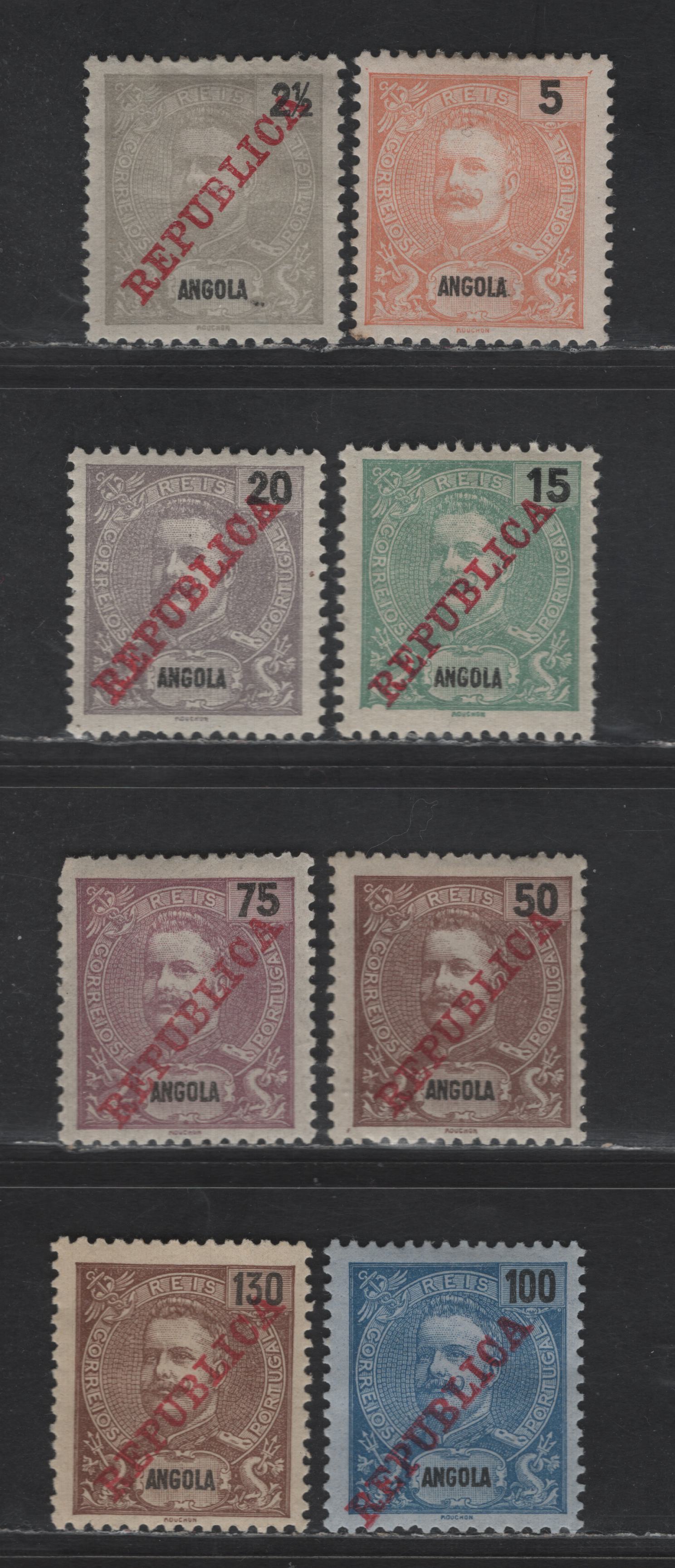 Lot 209 Angola SC#39, 88, 91-92, 94-96, 98 5r - 130r Orange & Black - Brown on Straw King Carlos - Republica, 1898-1903 King Carlos & Republica Overprinted Issues, 8 F/VFOG Singles