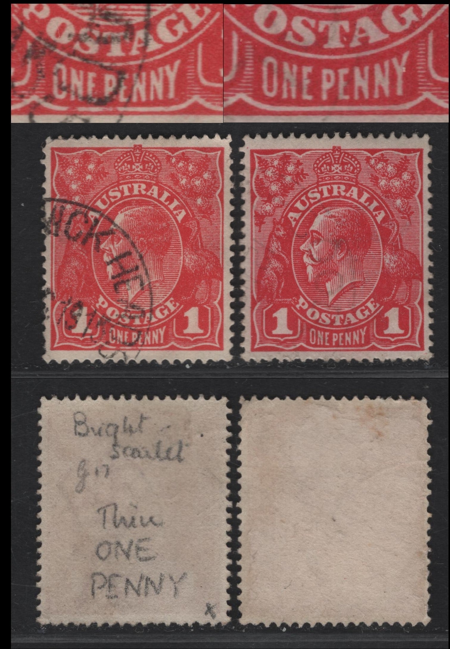 Lot 209 Australia SG#47avar, 47b 1d Deep Red - Rose Red King George V, 1916-1918 KGV Heads Issue, 2 Very Fine Used Singles, Two Examples, Comb Perf 14, Deep Red Shade Showing Thin 'One Penny', Other With Normal Letters, Single Crown Wmk.